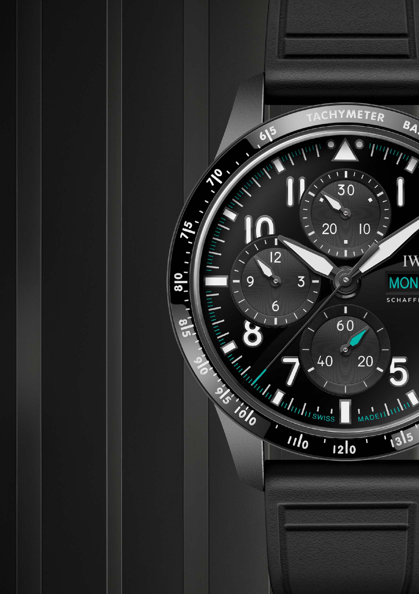 The IWC Pilot’s Watch Performance Chronograph 41 IW388306 blends motorsport influence with IWC’s engineering precision. Its 41 mm Ceratanium case offers a lightweight yet highly durable matte black finish. The in-house calibre 69385 delivers smooth chronograph operation, a day/date display, and dependable autonomy. A black dial, ceramic tachymeter bezel, and racing-inspired details underscore its AMG partnership. With 100 m water resistance and a quick-change rubber strap, it balances technical capability with everyday wearability.