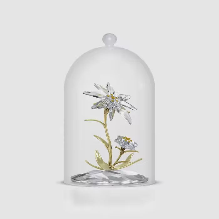 Created to celebrate Swarovski’s 130th anniversary, this wondrous bell jar is dedicated to the original Edelweiss emblem. The flowers themselves reveal a total of 259 precision-cut facets, with yellow pistils, and glossy stems and leaves in champagne gold-tone metal. Protected and displayed beneath a glass bell, this special creation is a showcase of Swarovski’s finest savoir-faire and enduring heritage. Decoration object. Not a toy. Not suitable for children under 15.