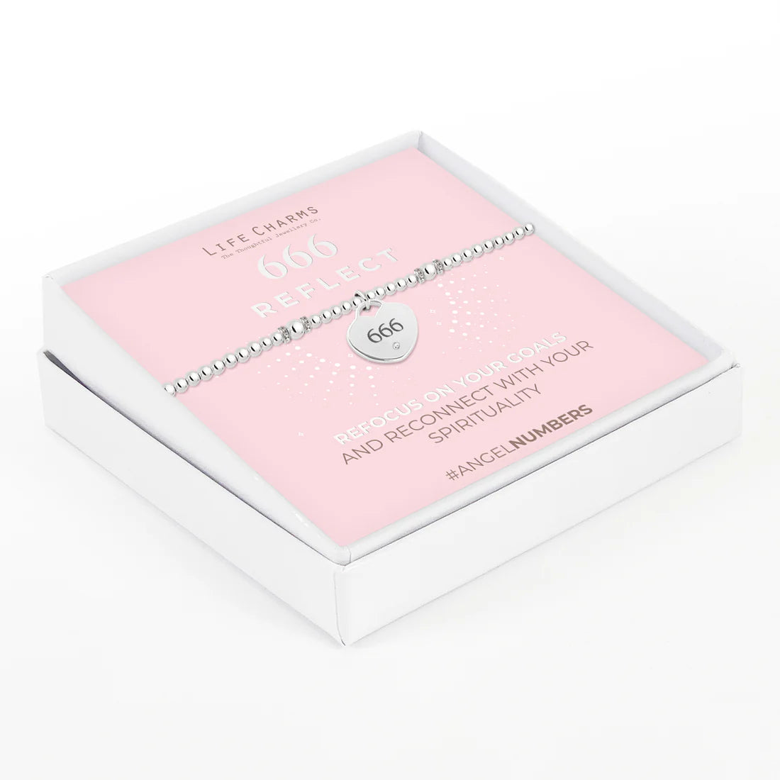 Crafted with plated sterling silver, and a polished heart charm engraved with an Angel Number presented on a 3mm & 4mm beaded stretch bracelet.
