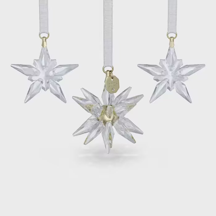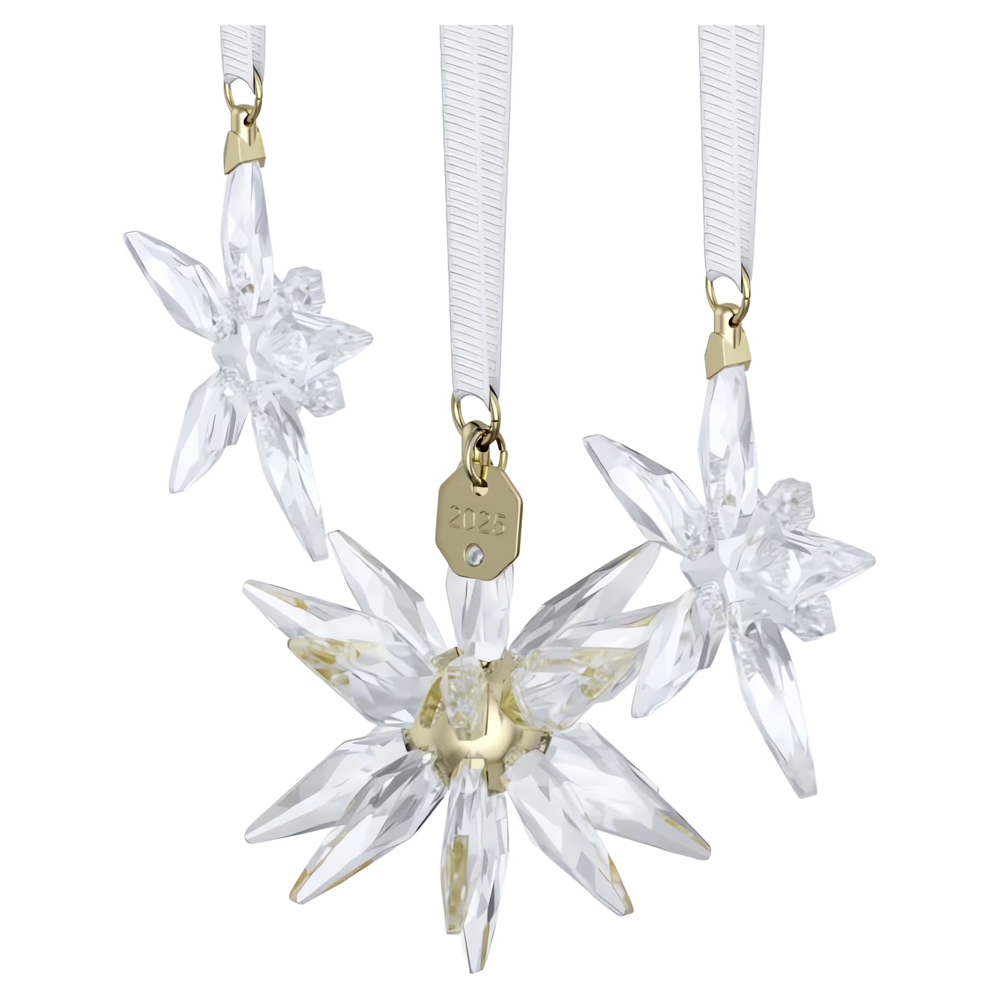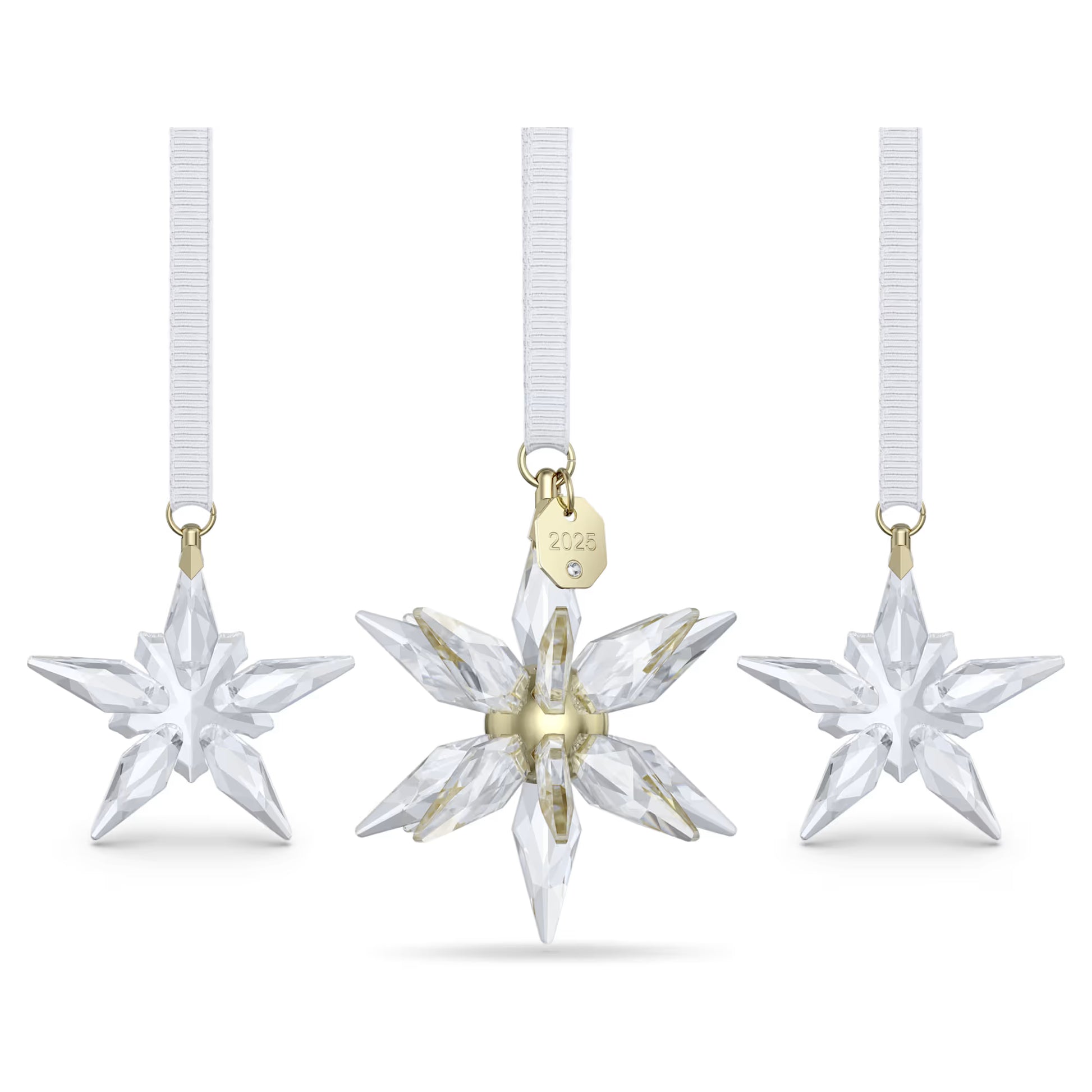 This Annual Edition 3D Ornament Set will bring light-filled magic to any festive décor. The glowing trio for 2025 is inspired by the serenity of the night sky and features an Annual Edition 3D Ornament and two Little Star ornaments. In total, the set is crafted with 773 precision-cut facets, with each piece suspended from a white grosgrain ribbon with champagne gold-tone plated accents including an engraved ‘2025’ tag on the large 3D star. A wonderful compilation of decorations to illuminate your tree or make a radiant centrepiece for your holiday celebrations. Decoration object. Not a toy. Not suitable for children under 15.