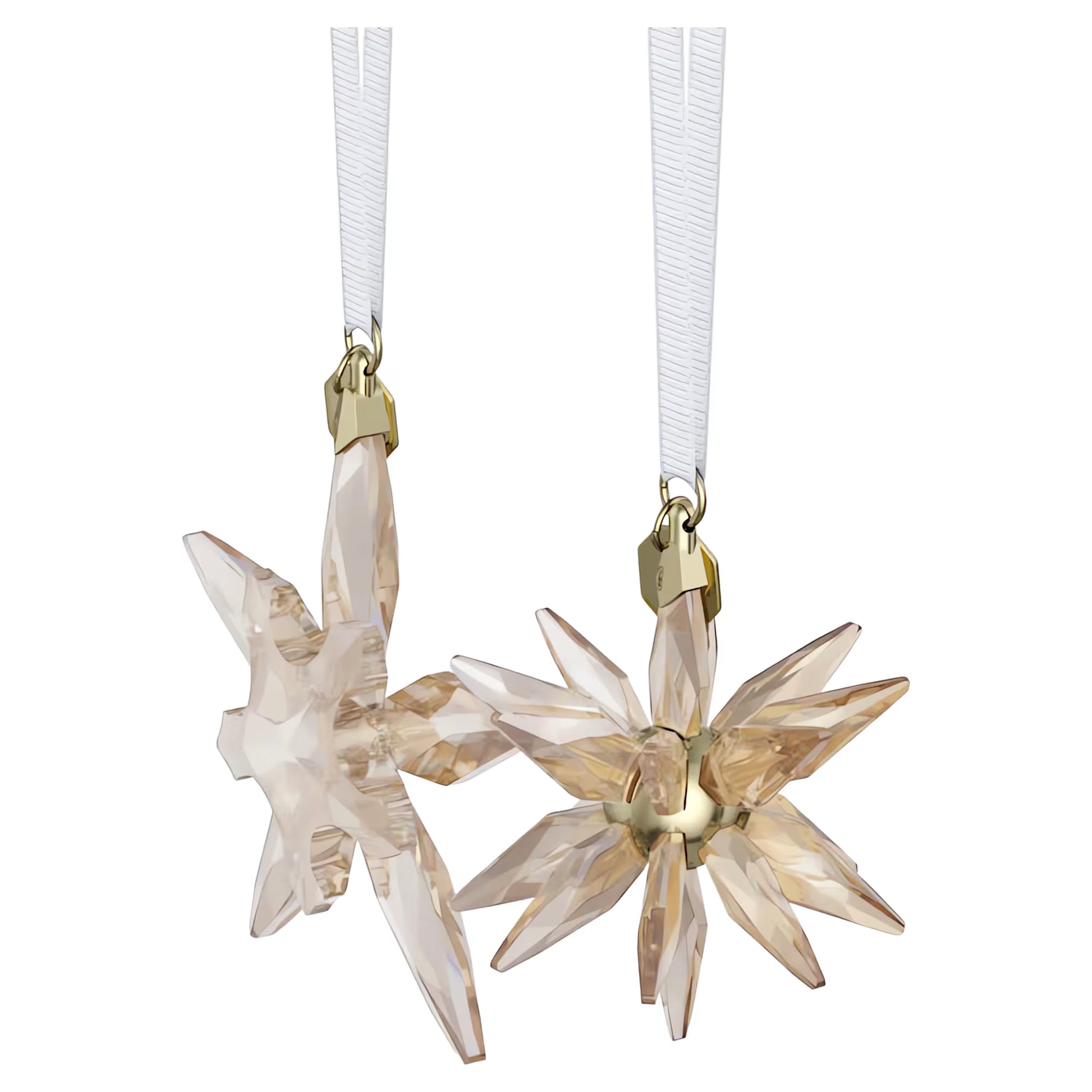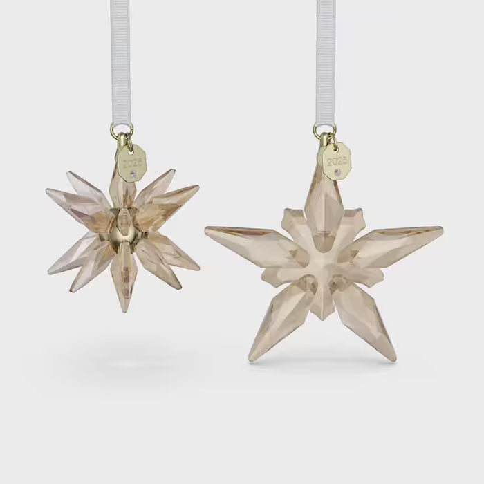 Create a warm glow throughout the holidays with the gold-tone stars in this Festive 3D Ornament Set. Inspired by the serenity of the night sky, the set includes an Annual Edition Festive Ornament 2025 and a matching 3D star. In total, the set is crafted with 583 precision-cut facets, with each piece suspended from a white grosgrain ribbon featuring a champagne gold-tone plated tag engraved with the year 2025. A single chaton is also placed in each tag for extra radiance. Hang this set on your tree to enjoy endless plays of light across the season. Decoration object. Not a toy. Not suitable for children under 15.