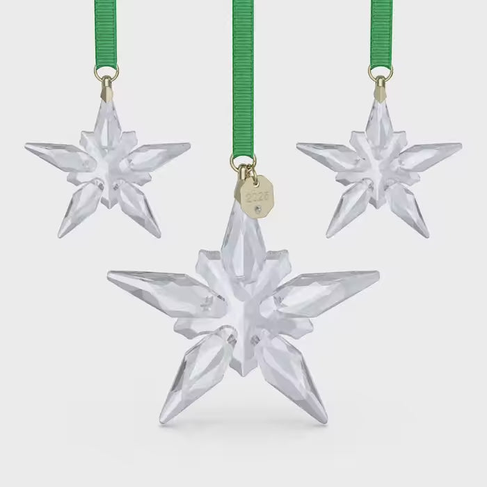 This magical holiday set continues the iconic tradition of Swarovski's Annual Edition Ornaments. The set features three clear stars, crafted with a total of 570 facets, that are inspired by the serenity of the night sky. Each star is suspended from a green grosgrain ribbon with champagne gold-tone plated accents, while the large star also includes a 2025 engraving on the tag. Designed especially for the festive season, this commemorative set would make a truly elegant gift or take pride of place in your own festive décor. Decoration object. Not a toy. Not suitable for children under 15.