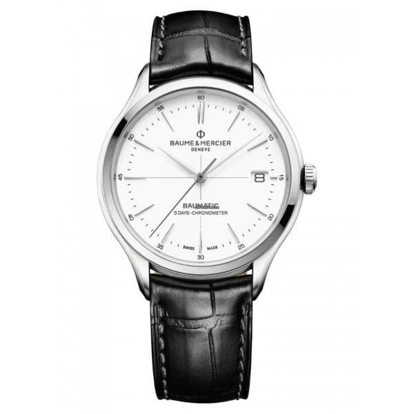 A sophisticated gentlemans wristwatch, the Clifton Baumatic 10518 is an automatic date watch for men, manufactured with a manufacture self-winding calibre. Its balanced aesthetic pairs a timeless black alligator strap with a white dial, featuring both hour and minute time markers and the iconic date aperture at 3 oclock. The steel case is finished with a transparent sapphire case back, through which the COSC automatic movement can be observed.