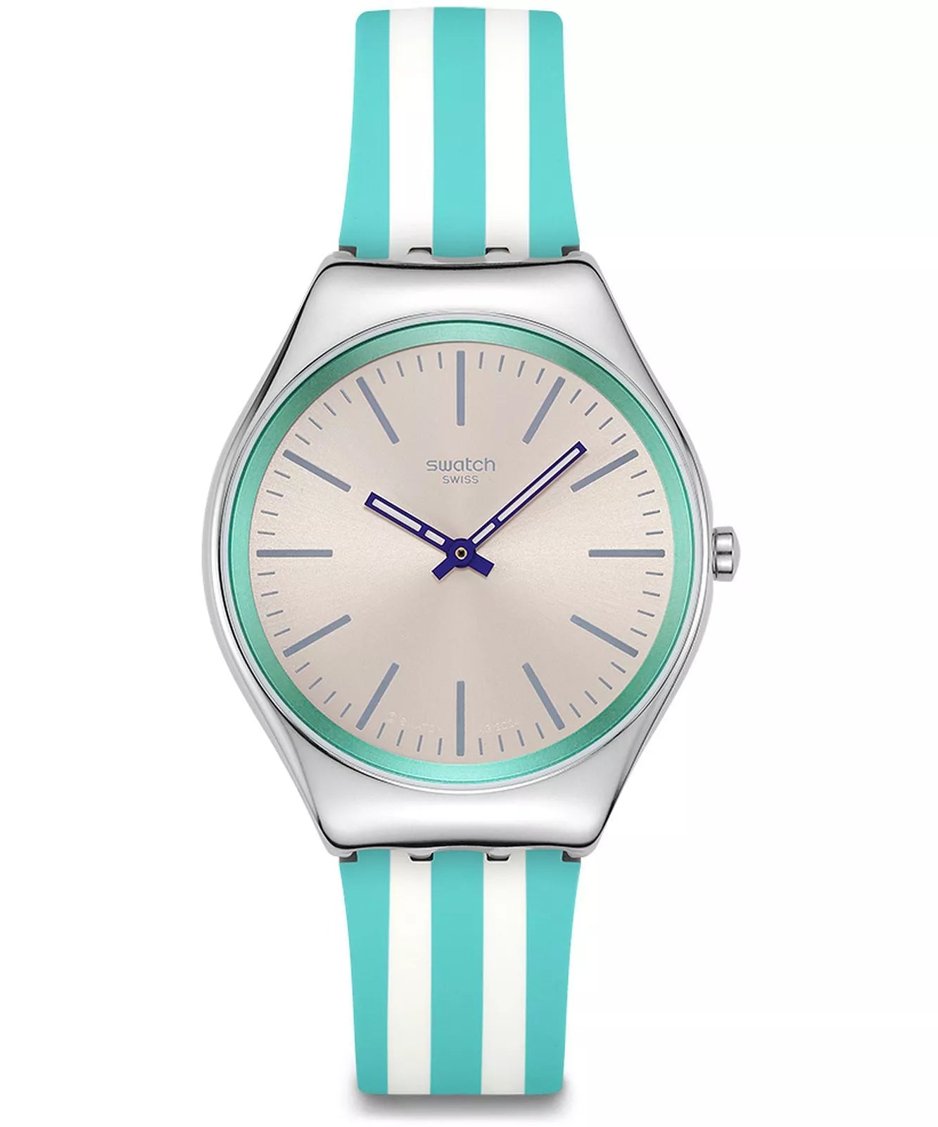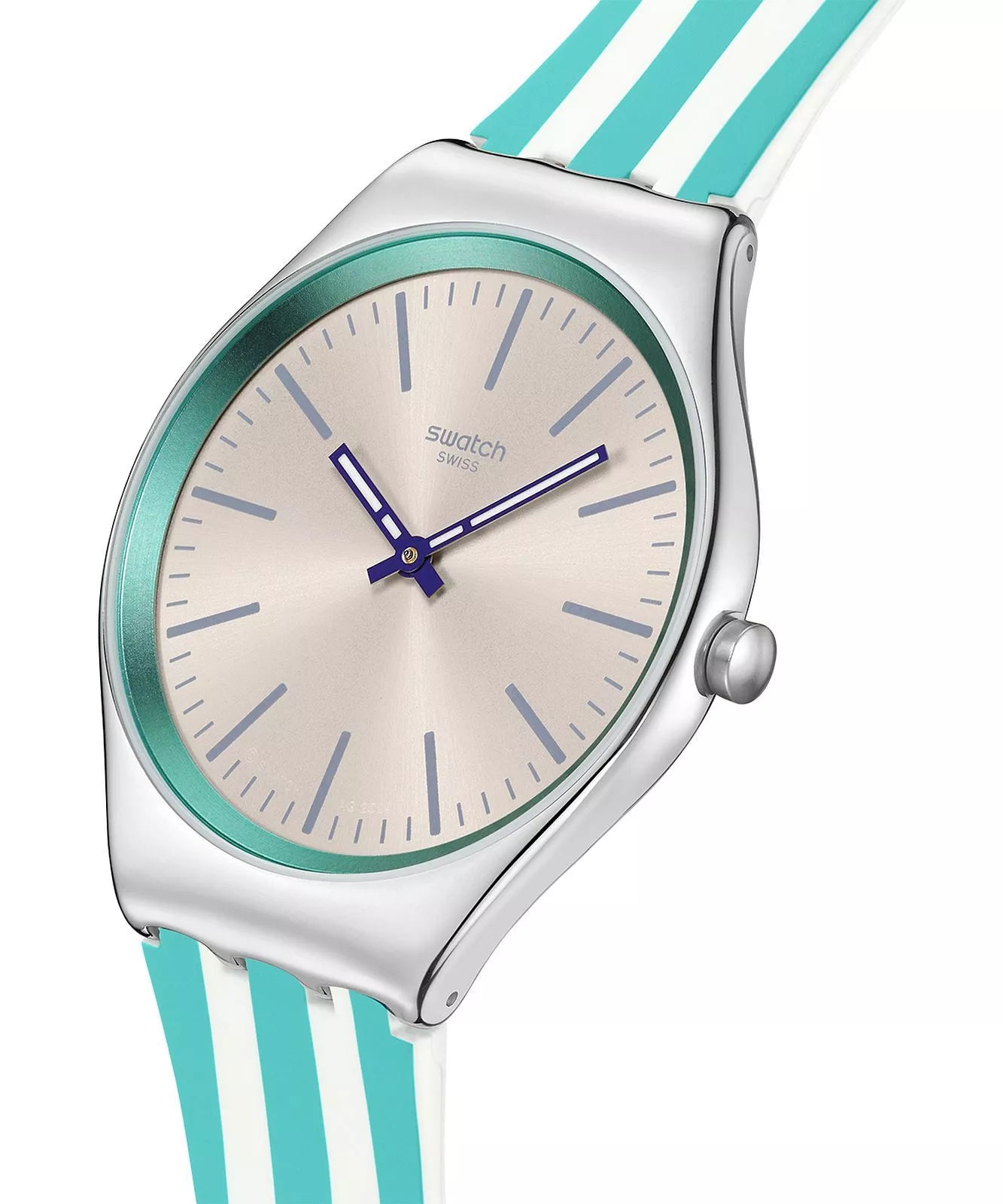 A slim dress/style watch — the Skin Irony line is known for elegant profiles, combining metal cases with slim build. Colour scheme evokes summer / beach vibes: turquoise & white strap, silver‑sun brushed dial, with a turquoise flange to frame the dial.