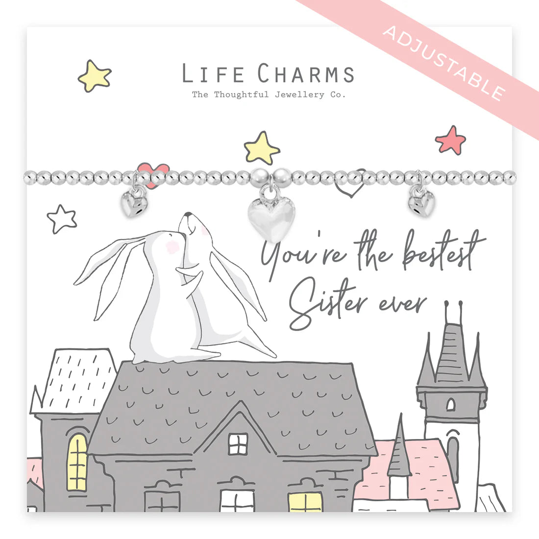 The bracelet features 3mm silver plated beads with adjustable slider, 3 puffed heart charms, and sits presented on the most gorgeous gift card.
