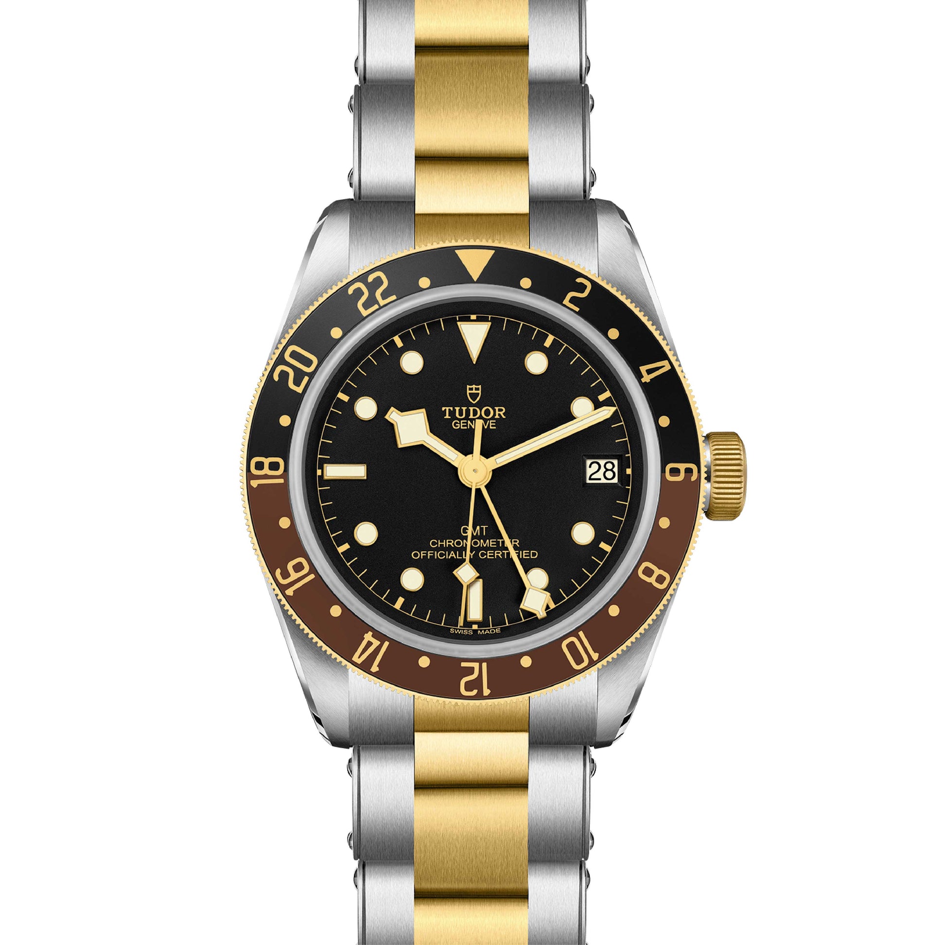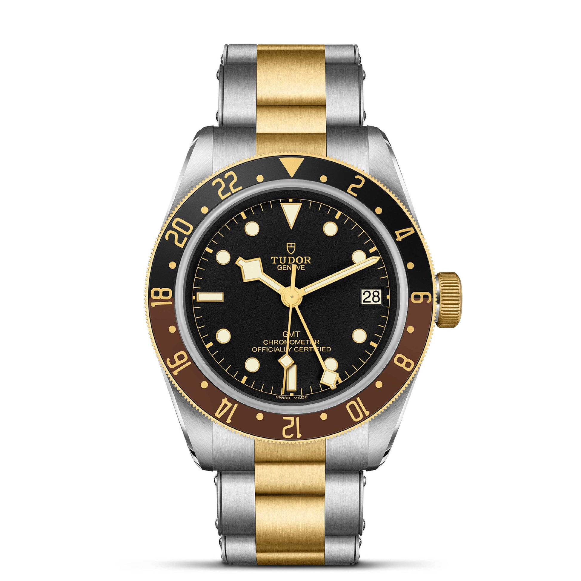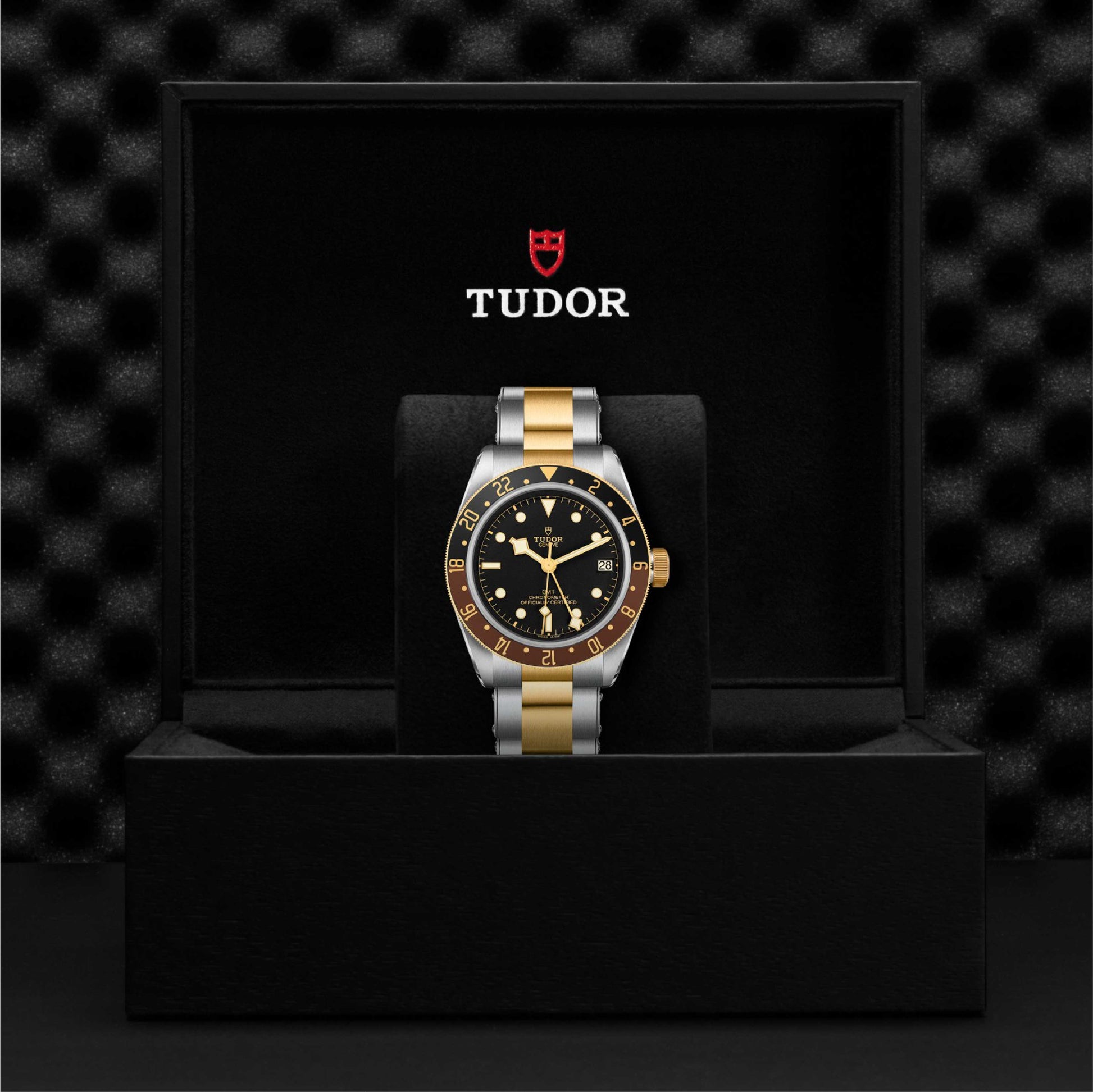 The Tudor Black Bay GMT (ref. M79833MN-0001) features a robust 41 mm stainless steel and 18 k yellow gold case with a bidirectional 48-click GMT bezel in blue and burgundy for tracking a second time zone. Its matte black dial is paired with luminous snowflake hands and bold hour markers for clear legibility day and night. Powered by Tudor’s in-house automatic calibre with GMT function and solid power reserve, it delivers precise timekeeping across multiple zones. A sapphire crystal protects the dial while enhancing the watch’s sporty profile. Finished on a two-tone steel and gold bracelet with polished and satin surfaces, it blends luxury accents with tool-watch capability.