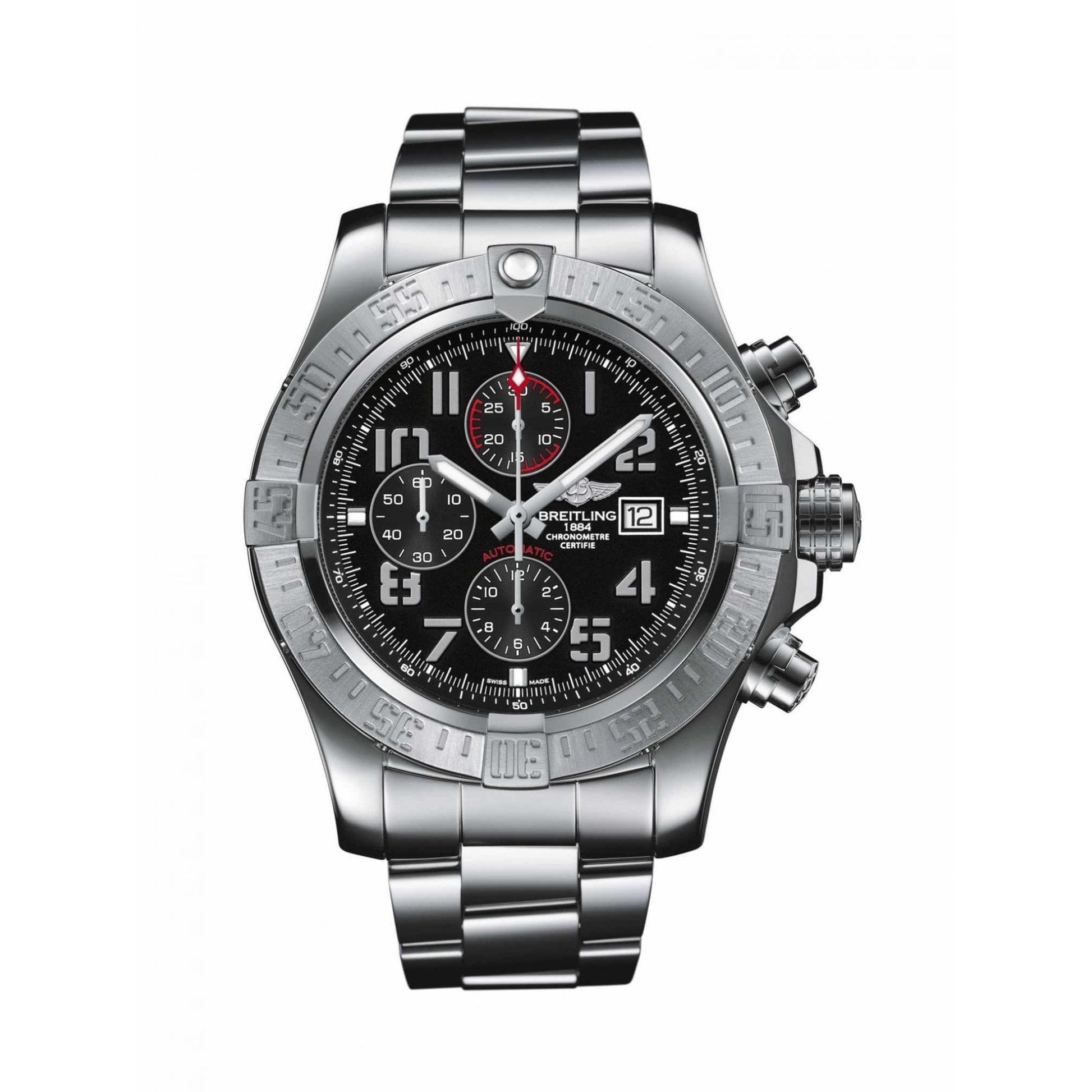 The embodiment of power in action, the Avenger II chronograph comes with hour-markers, on a stainless steel 'Professional III' bracelet. The steel case, water-resistant to 300 m (1,000 ft), with screwed-in pushpiece guards, houses a selfwinding chronograph movement that is officially chronometer-certified – like all Breitling movements. The titanium caseback bears a conversion scale for Anglo-Saxon and metric measurements. A model of reliability, ergonomics and efficiency.