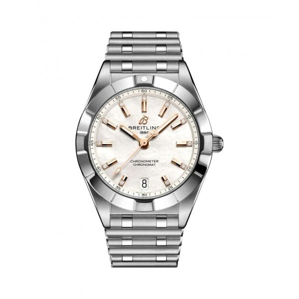 Stylish yet elegant, the modern-retro inspired Chronomat 32 is the versatile sporty and chic watch for any occasion. It is available in an array of metal cases, from cool stainless steel, to goes-with-everything bicolor, or even luxurious 18k red gold. Women craving extra sparkle will also be able to opt for diamond-set bezels, indices, and colorful dials. Featuring Breitlings iconic and comfortable Rouleaux bracelet with a butterfly clasp, the Chronomat 32 is powered by the Breitling Caliber 77, a COSC-certified SuperQuartz chronometer.