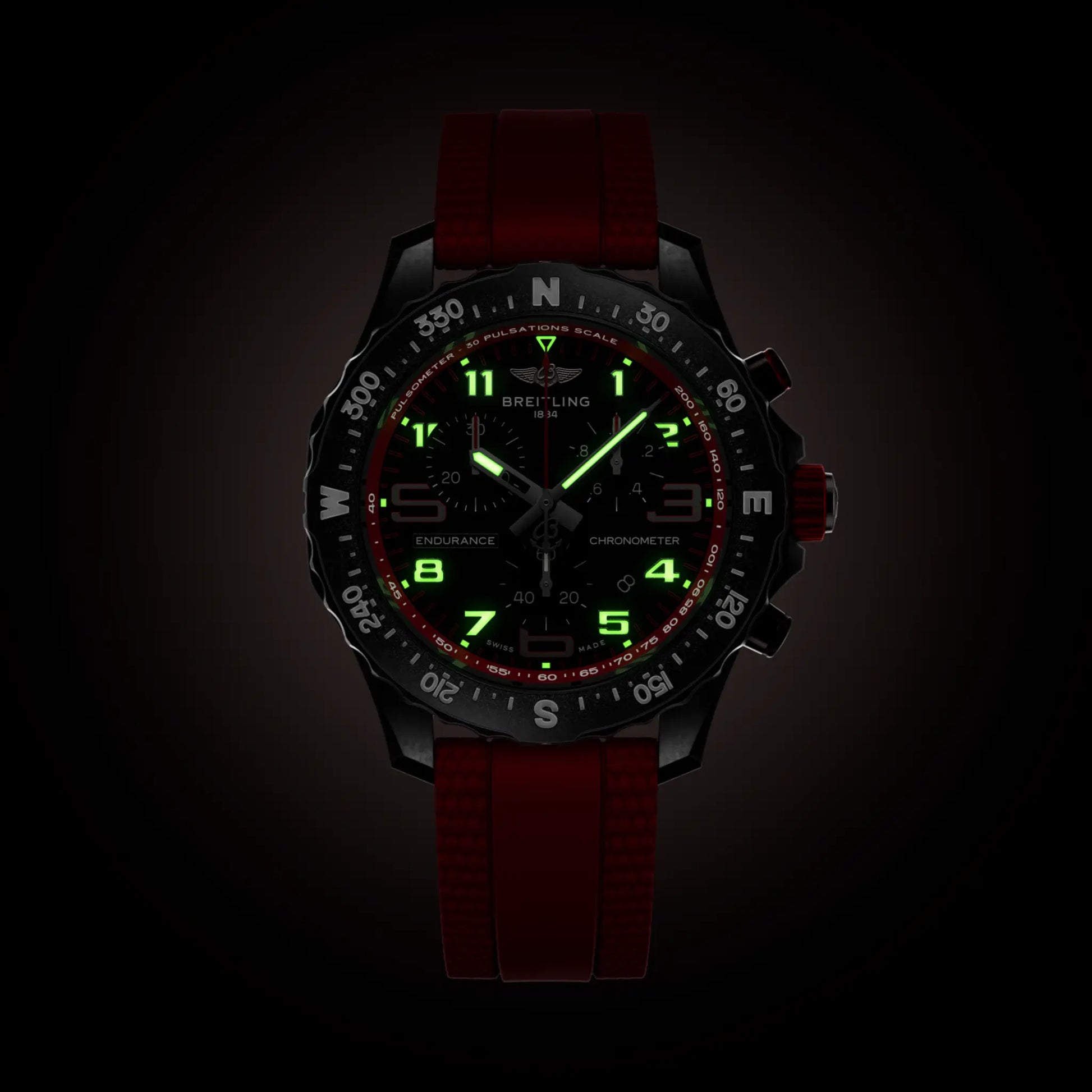 Designed to be both a lightweight timepiece for athletes and a casual, everyday sports chronograph, the Endurance Pro perfectly blends innovative technology with a vibrant design to produce the ultimate athleisure watch. Designed for men and women whose active lives combine a professional mindset with a sporty lifestyle, the Endurance Pro is up to the challenges of a rigorous workout, but fashionable enough for everyday wear. The Endurance Pro features an ultra-light Breitlight® case, a robust material 3.3 times lighter than titanium and 5.8 times lighter than stainless steel. Non-magnetic, thermally stable and hypoallergenic, Breitlight® is highly resistant to scratches, traction and corrosion. It also has a feel that is warmer than metal and a slightly textured effect, accentuating the originality of the design. Exclusive to Breitling, the material is 100-percent Swiss-made. In 44 mm or 38 mm, the Endurance Pro is available to athletes with a multitude of colorful dials and rubber straps all fitting a Breitlight® tang-type buckle. The two sizes are respectively powered by Breitling’s Caliber 82 and 83, both COSC-certified SuperQuartz™ chronographs delivering exceptional precision.