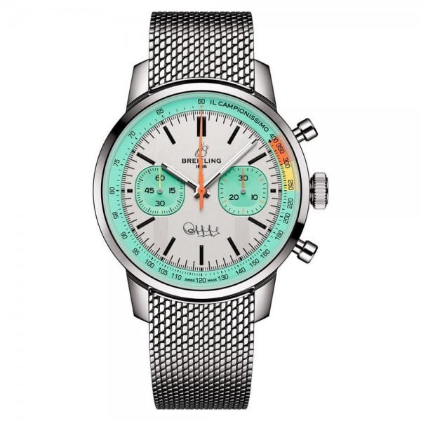 Introduced in the transformative 1960s, Willy Breitling’s unconventional line of racing-inspired chronographs captured the era’s freewheeling vibe. Today, the new Top Time collection channels that adrenaline-fueled energy, blending modern-retro design with cutting-edge performance. Fausto Coppi and Gino Bartali weren’t just champions—they were symbols of sportsmanship. Both were Breitling ambassadors at a time when the brand was the official timekeeper for cycling’s greatest races and their love of the sport inspired millions. The Top Time B01 Fausto Coppi features turquoise subdials on a white dial, with an orange lightning-shaped seconds hand echoing the colors of Coppi’s bike. The chronograph features Coppi’s nickname on the tachymeter scale: “Il Campionissimo” (Champion of Champions) and its signature at six o’clock makes the connection even more personal. The 41 mm chronograph runs on Breitling’s Manufacture Caliber 01, offering COSC-certified precision and a 70-hour power reserve. A transparent caseback reveals the intricate movement, its outer ring engraved with “Fausto Coppi Tribute” and “One of 750.” Unforgettable in its time, reimagined for ours, the Top Time B01 Coppi honors the resilience and friendships forged even in the fiercest competition.