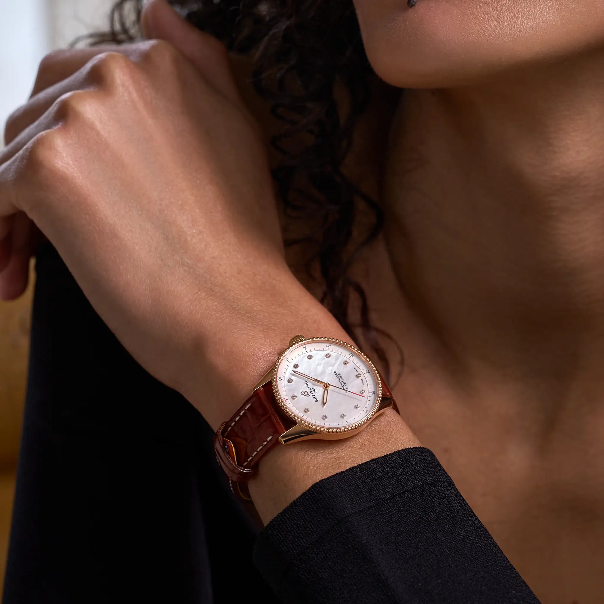 Breitlings iconfor the journey. The Navitimer is one of the most recognizable watches ever made. Its on collectors lists of the greatest watches of all time. What began in 1952 as a tool for pilots has gone on to mean something profound to every single person who has had this timepiece along on their personal journey. Our icon now comes in 36 and 32 mm sizes for women and men who love the look and feel of a smaller diameter watch. While the 36-mm Navitimer features the beaded bezel and iconic circular slide rule that gives the Navitimer its unmistakable appearance, the dazzling 32 mm variation forgoes the slide rule in favor of a simplified dial design suited to its slim diameter. But these showstoppers have so much more to offer than just their trim new sizes. Pops of pastel, mother of pearl, and traceable precious materials combine with subtle refinements to give the timepieces a jewelry-like appealadding a versatile elegance to the legendary navigational watch thats ready for wherever the journey takes you.