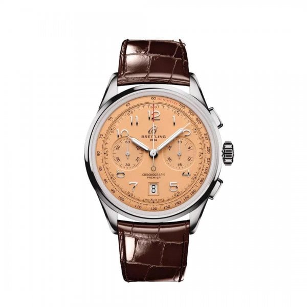 In the early 1940s, Willy Breitling was already dreaming of a time after the war, when utility would give way to unbridled optimism. He began designing a chronograph that would be functional but also undeniably elegant and infinitely wearablein his words, the unmistakable stamp of impeccable taste. He called this new line the Premier. To create its modern Premier, Breitling preserved distinctive vintage-Premier details, including the smooth fixed bezel, twin-register dial, streamlined rectangular pushers and applied Arabic numerals. The Premier B01 Chronograph 42 is available in an array of dial colors and case materials. It comes on a choice of classic alligator leather strap or sleek 7-row metal bracelet. Todays Premier also lives up to Willy Breitlings uncompromising technical standards with its exceptional self-winding movementthe COSC-certified Breitling Manufacture Caliber 01designed for maximum precision, reliability and functionality.