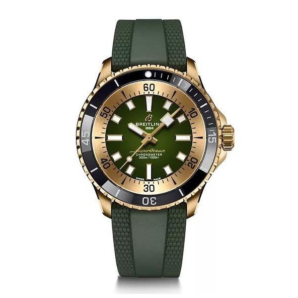 Performance and style for all your water-based pursuits. In the 1960s, the new sport of scuba diving was all the rage. For divers, timing was everything, and Breitling set out to give them the most clear-cut dive watch possible by eliminating any feature that didnt support their lifesaving needs underwater. This pared-down watch was named the Slow Motion. What remained were clean lines, chunky luminescent indexes, squared-off hands and a high-contrast dial ring, all aimed at maximum legibility. Practical, yes. But what people really fell in love with was the look. The new Superocean retraces the Slow Motion's celebrated design codes, while adding modern features, like a ceramic-inlayed bezel and brightly colored dials. Broad hands and indexes in luminescent Super-LumiNova allow for easy readability underwater. The watch is water resistant to 300 m (1000 ft), as well as being shock-, sand- and saltwater-resistant. The bronze version uses a special alloy that has excellent resistance to corrosion, yet will still develop a subtle patina over time that makes the watch even more unique. The two strap options (rubber and metal bracelet) have a folding clasp that allows for micro-adjustments of up to 15 mm for easy wear over rashies and wetsuits. Its scratch-proof ceramic inlayed bezel will never wear or fade. For safety, the bezel is uni-directional on most sizes and bi-directional with a patented lock on the 46 mm. Best of all, this is no longer strictly a dive watchsurf with it, swim with it, hit the beach bar with it, then wear it out to dinner. The Superocean perfectly balances the nostalgia of its heritage with a fresh new look.