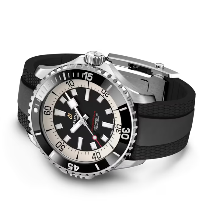 Performance and style for all your water-based pursuits. In the 1960s, the new sport of scuba diving was all the rage. For divers, timing was everything, and Breitling set out to give them the most clear-cut dive watch possible by eliminating any feature that didnt support their lifesaving needs underwater. This pared-down watch was named the Slow Motion. What remained were clean lines, chunky luminescent indexes, squared-off hands and a high-contrast dial ring, all aimed at maximum legibility. Practical, yes. But what people really fell in love with was the look. The new Superocean retraces the Slow Motion's celebrated design codes, while adding modern features, like a ceramic-inlayed bezel and brightly colored dials. Broad hands and indexes in luminescent Super-LumiNova allow for easy readability underwater. The watch is water resistant to 300 m (1000 ft), as well as being shock-, sand- and saltwater-resistant. The bronze version uses a special alloy that has excellent resistance to corrosion, yet will still develop a subtle patina over time that makes the watch even more unique. The two strap options (rubber and metal bracelet) have a folding clasp that allows for micro-adjustments of up to 15 mm for easy wear over rashies and wetsuits. Its scratch-proof ceramic inlayed bezel will never wear or fade. For safety, the bezel is uni-directional on most sizes and bi-directional with a patented lock on the 46 mm. Best of all, this is no longer strictly a dive watchsurf with it, swim with it, hit the beach bar with it, then wear it out to dinner. The Superocean perfectly balances the nostalgia of its heritage with a fresh new look.