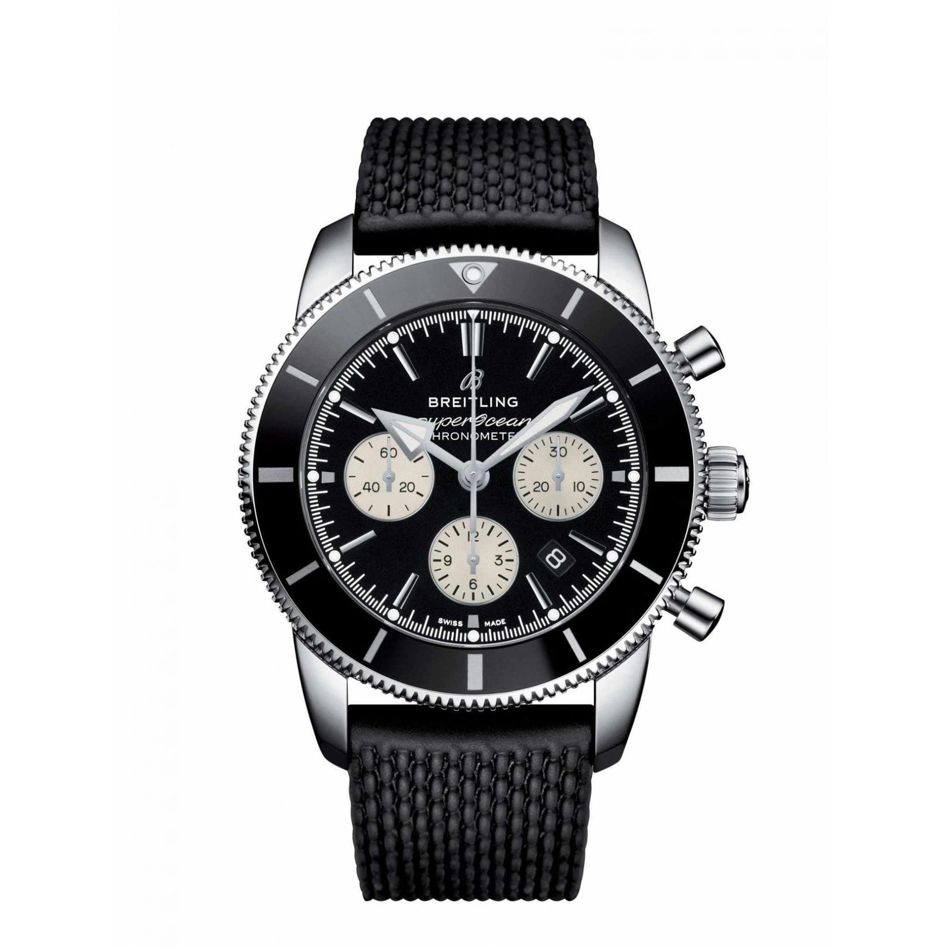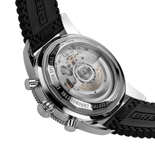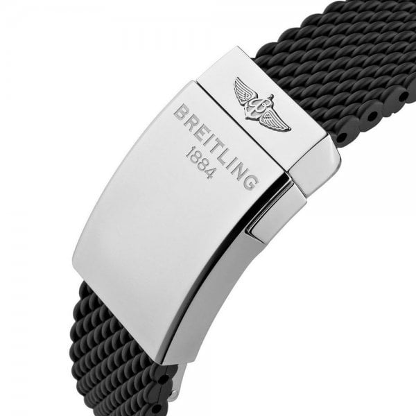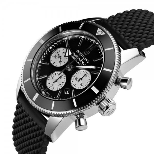 Robust and timeless, this Superocean Heritage model is powered by the in-house Breitling Manufacture Caliber 01. The 44 mm-diameter dial is available in black or blue with silver counters, or in silver with black bezel and counters a stylish contrast on the wrist. With black rubber or steel mesh bracelet, the sturdy, reliable Superocean Heritage B01 Chronograph 44 is designed to endure the most challenging of voyages.