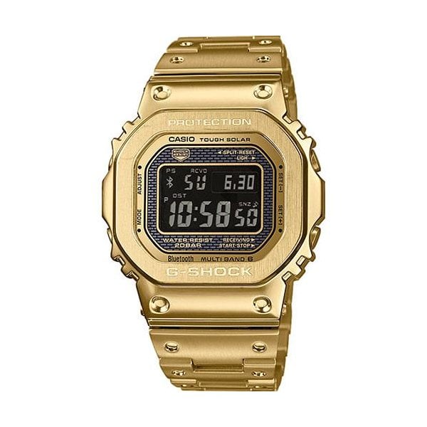 A stylish nod to the original G-SHOCK, the Full Metal collection is a celebration of our brand's heritage. This bold re-imagination of our recognisable DW-5000 rectangle shaped watch, with easy to read digital screen display, has proven to be a fan favourite since the collection launched in 2018. The full-metal hard stainless steel case and the bezel of this model have an ion-plated finish in a rich gold colour. The case and band also feature hairline finishes to maximize the elegance and presence of the metal. Light-on-dark LCDs further add to the overall chic look of this timepiece.