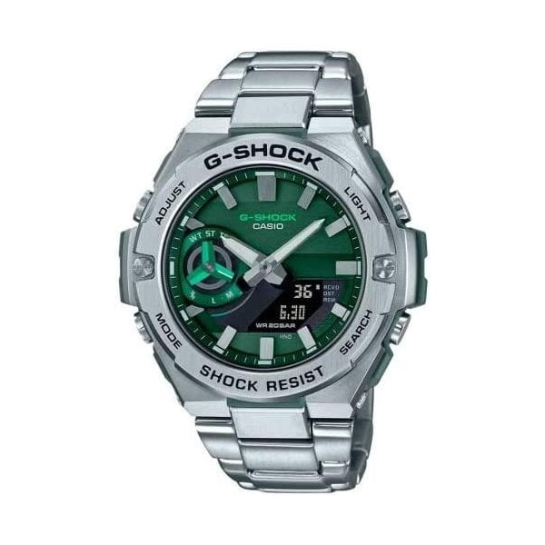 The thin module of the GST-B500 is made possible by downsizing components without sacrificing Bluetooth® functions, solar power capabilities or other functions. A carbon core guard structure makes this the thinnest model in the G-STEEL series (as of March 2022) while maintaining a high degree of impact resistance.The GST-B500AD-3AER has a stainless steel band and bezel with sophisticated green highlights on the face. These new G-STEEL series models combine metal and resin to create a collection of tough and fashionable timepieces