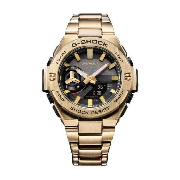 The thin module of the GST-B500 is made possible by downsizing components without sacrificing Bluetooth functions, solar power capabilities or other functions. A carbon core guard structure makes this the thinnest model in the G-STEEL series (as of March 2022) while maintaining a high degree of impact resistance.The GST-B500GD-9AER has a gold coloured stainless steel band and bezel with a sophisticated black and gold face. These new G-STEEL series models combine metal and resin to create a collection of tough and fashionable timepieces