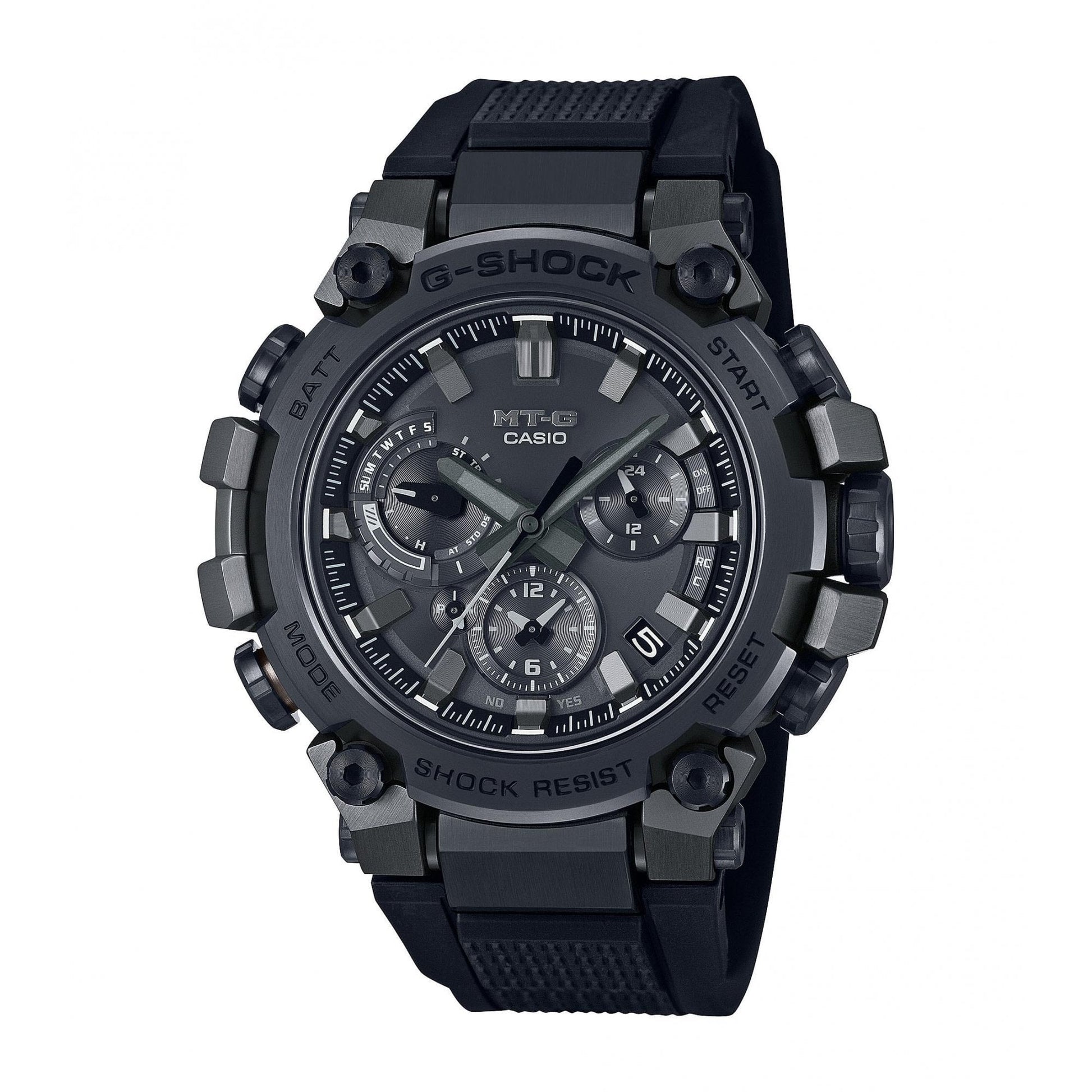 Introducing an all new MTG series for 2022. With its advanced Dual Core Guard structure, the module is protected by a carbon-reinforced resin case and exterior metal components. Repeated pressing, cutting, and polishing builds the stainless steel case back upward into an intricate 3D form. The case back also serves as the lugs to secure the band and as the guards for the crown and buttons, providing a completely new structure. A new one-touch release system eliminates the need for special tools for removing the band, simply press the buttons located on either side of the lug to quickly release the strap. These innovative designs and technologies create a much thinner watch, and when added to sapphire crystal, Multi Band 6 radio controlled and Bluetooth® connectivity, Tough Solar charging, and a high-brightness LED light, this timepiece offers maximum tech and leading edge styling for the ultimate timepiece. In chic monochromatic black and grey, the MTG-B3000B-1AER features a soft urethane band and grey ion plating.