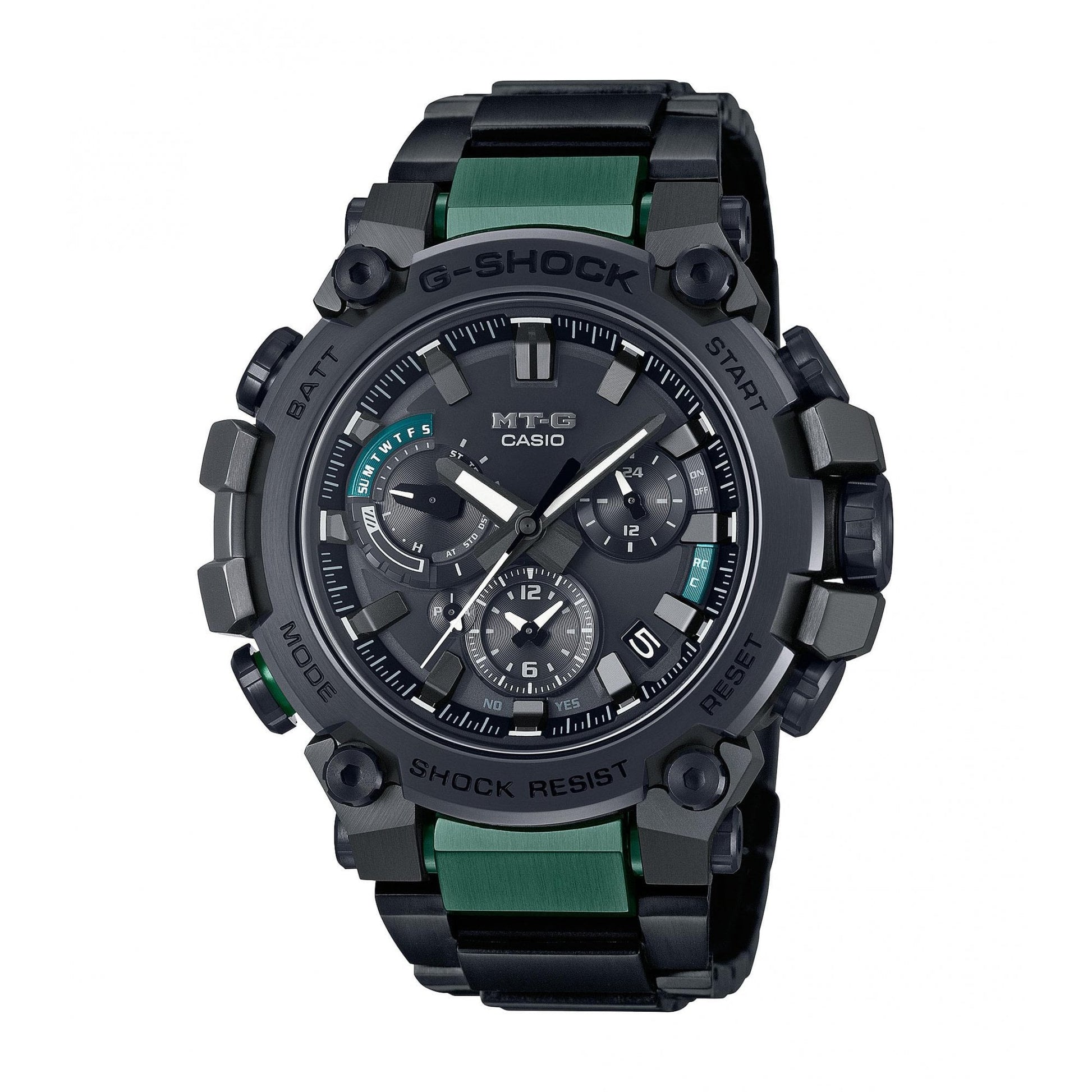 Introducing an all new MTG series for 2022. With its advanced Dual Core Guard structure, the module is protected by a carbon-reinforced resin case and exterior metal components. Repeated pressing, cutting, and polishing builds the stainless steel case back upward into an intricate 3D form. The case back also serves as the lugs to secure the band and as the guards for the crown and buttons, providing a completely new structure. A new one-touch release system eliminates the need for special tools for removing the band, simply press the buttons located on either side of the lug to quickly release the strap. These innovative designs and technologies create a much thinner watch, and when added to sapphire crystal, Multi Band 6 radio controlled and Bluetooth® connectivity, Tough Solar charging, and a high-brightness LED light, this timepiece offers maximum tech and leading edge styling for the ultimate timepiece. The MTG-B3000BD-1A2ER features a layered composite band made of hollow stainless steel segments encasing fine resin parts for a lighter weight band. Ion-plated metal components bring a touch of fresh colour to the overall chic black design.