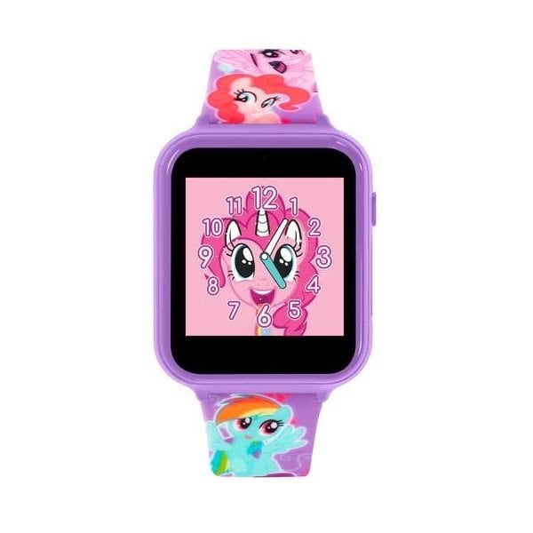 Watch My Little Pony iTime Unisex Kids Interactive Smartwatch – Model# MPC4101WMC is the first of its kind, integrating your child’s favorite characters with the fun and excitement of technology. This kids licensed Smartwatch for boys or girls is an interactive watch that features 10 character clock faces (5 digital and 5 analog); 6 fun touch-activated games; a front facing selfie camera and viewer for taking and viewing photo and video; a voice recorder; a fitness tracker to track your steps, calories and distance; three changeable wallpapers; a basic arithmetic calculator; and time tools such as an alarm with three custom alarm tones, a timer, and a stopwatch!