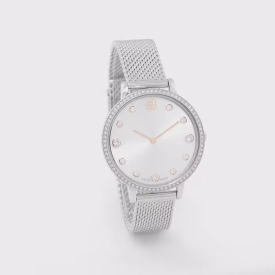 This sleek Clarica watch is distinguished by its signature Milanese bracelet, which delivers a striking mesh style around the wrist. The 35 mm design is crafted in stainless steel and features a perfectly circular bezel set with 73 clear crystals. On the sunray dial, the timepiece reveals 11 crystal indexes, a swan emblem at 12 o’clock and rose gold-tone hands. This Swiss Made watch is water-resistant to 50 m and offers a classic choice for everyday luxury.