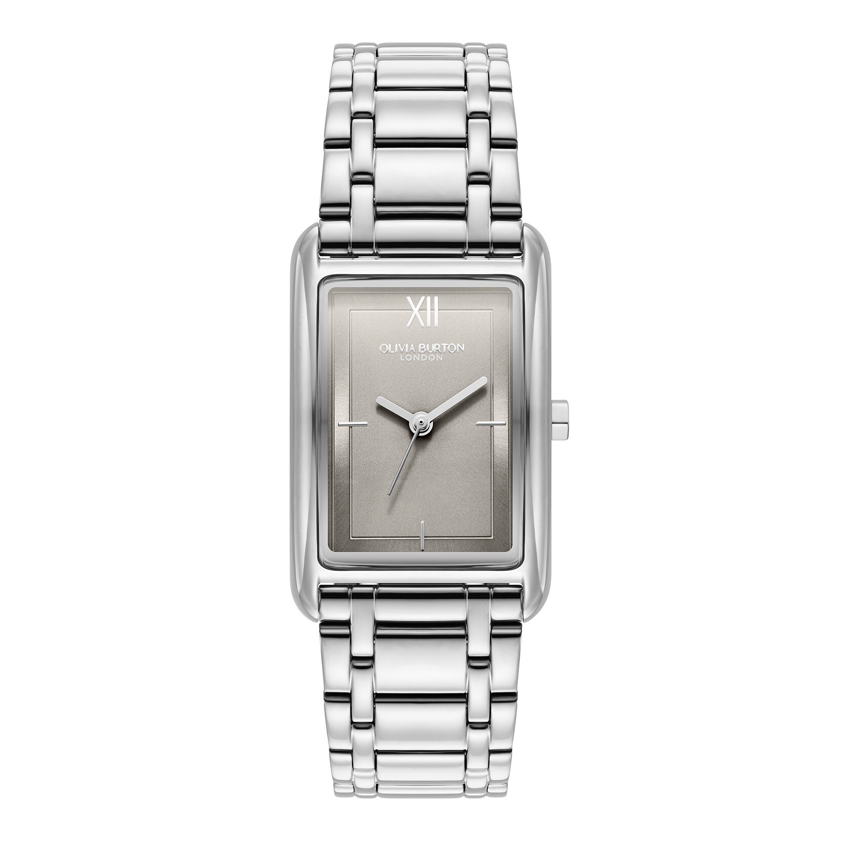 Our rectangular Grove dial is just the style for fans of classic design with a playful twist. The rectangular face is full of sophisticated details with a powdered centre and sunray border in Dove Grey. A slim metal case in a silver finish and minimalist markers make for simple everyday elegance. Finished with a 5-link bracelet strap, this watch elevates any look, day or night.