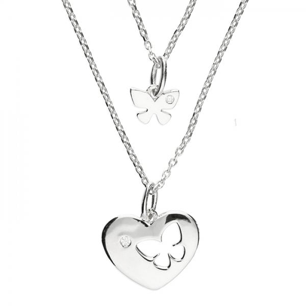 Set of two butterfly pendants with cubic zirconia. One larger set in a heart shape, one small cut-out