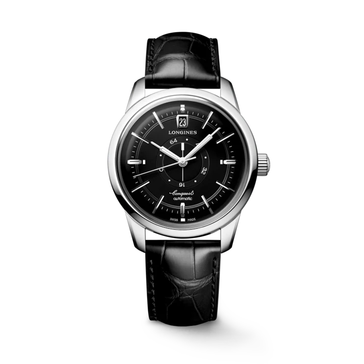 Longines is presenting the new CONQUEST HERITAGE CENTRAL POWER RESERVE in a 38 mm diameter case. Self-winding mechanical movement, exclusive Longines calibre L896.5 with power reserve on rotating discs in the centre of the dial. An iconic model revisited in a black dial paired with an integrated black alligator leather strap to mark the Conquest collection’s 70th anniversary.