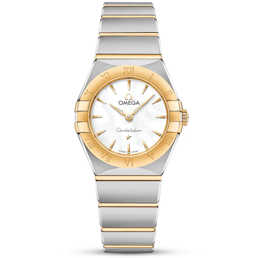 This 25 mm 18K yellow gold and stainless steel model features a bezel engraved with Roman numerals, white mother-of-pearl dial and scratch-resistant saphire crystal. The hands, OMEGA logo, Constellation star and indexes are also in 18K yellow gold.