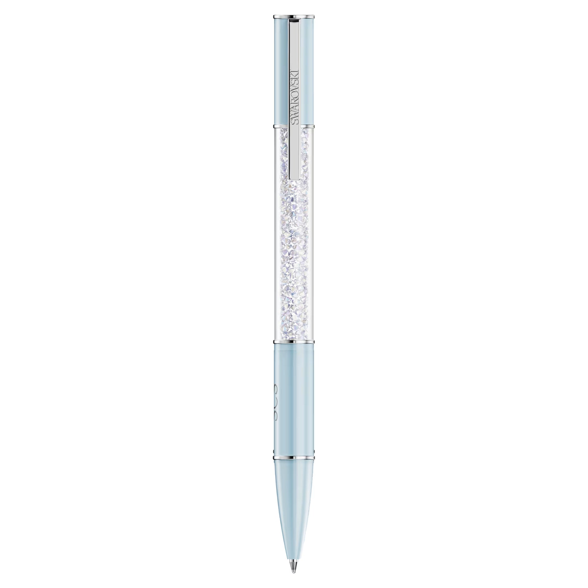 An SCS Exclusive, this luxurious Crystalline ballpoint pen takes inspiration from vivid colour. The distinctive writing instrument features a round barrel in light blue, proudly adorned with the Swarovski Crystal Society logo. Chrome accents include a functional clip engraved with the Swarovski name. At its centre, this eye-catching design is illuminated with approximately 480 glittering crystals, each meticulously added using the iconic Crystalline technique. A standout addition to your desk or a distinctive gift for the writers in your life, this pen is packaged in an exclusive pouch and box, both embellished with the SCS logo. Black and blue ink refills are available to buy in Swarovski stores.