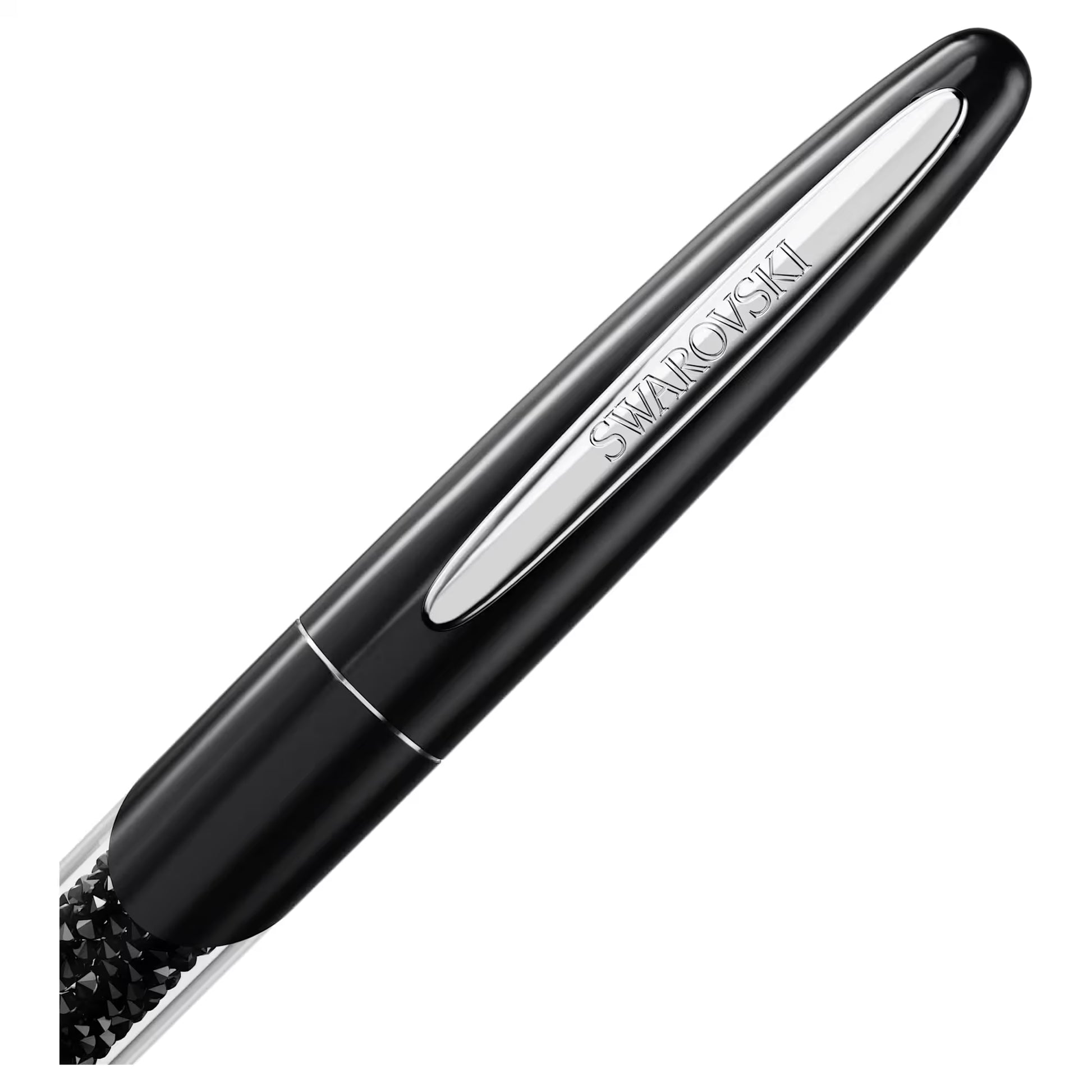 Much more than just a writing instrument, this Crystalline rollerball pen is filled with approximately 400 black crystals using the unique Crystalline technique. A silver-tone plated clip helps to enhance the glossy barrel and cap in black. This slimline rollerball pen would make a thoughtful gift. Black and blue ink refills are available to buy in Swarovski stores.