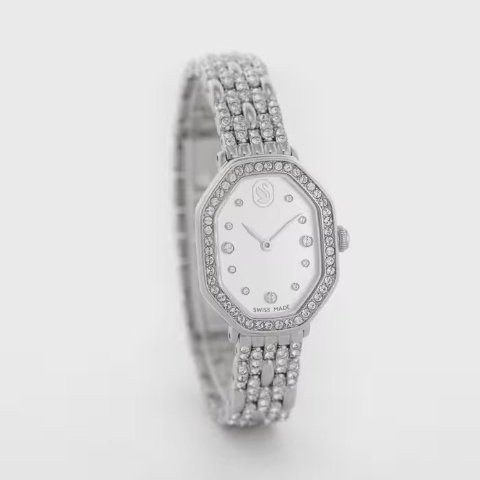 Inspired by the timeless elegance of the Dextera family, this 18 x 23 mm watch is uniquely crafted in Swarovski’s iconic octagon shape. Made in stainless steel, the design features a pavé bezel set with 46 crystals, and an additional crystal set within the crown. The sunray dial also includes delicate crystal indexes, along with slender hands and a swan logo at 12 o’clock. To complete this radiant creation, the five-link bracelet is adorned with 108 round-cut crystals, giving you endless shimmer at every hour. This Swiss Made watch is water resistant to 50 m.