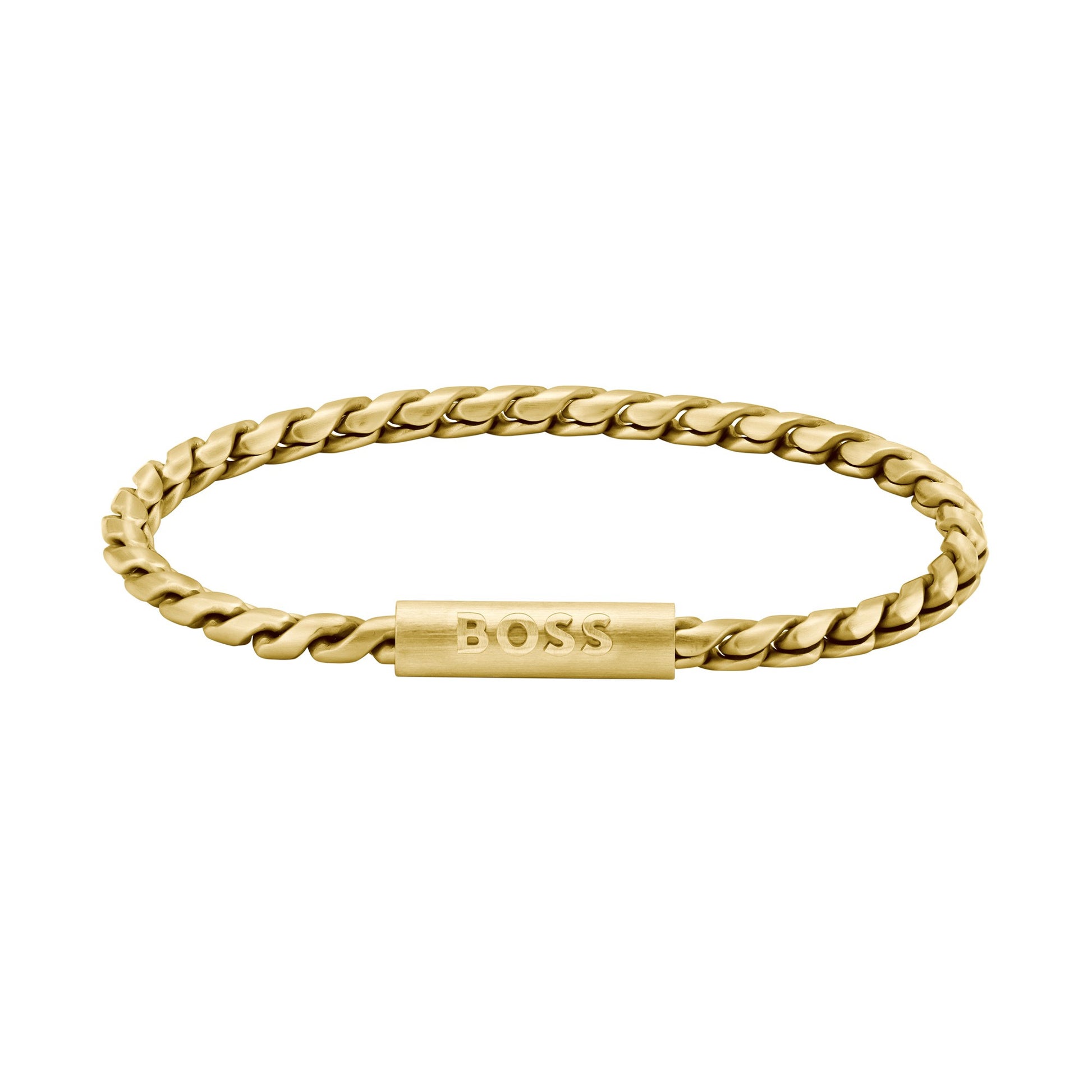 Presenting the BOSS Doran Yellow Gold-Tone Men’s Bracelet 1580696, a bold and stylish accessory for the contemporary gentleman. Expertly crafted from durable stainless steel, it features a luxurious yellow gold-tone finish that adds a touch of elegance to any ensemble.