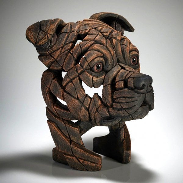 Staffordshire Bull Terrier bust by Matt Buckley - from the EDGE contemporary sculpture collection. Originally bred in the 19th century as a fighting dog, the Staffordshire Bull Terrier is these days very much a family pet and show dog. The Staffy's active, friendly, intelligent and cheeky nature has made them a big hit with owners. Matt Buckley's superb sculpture has caught the spirit of this popular dog perfectly. This sculpture has the brown tones of the brindle Staffy.