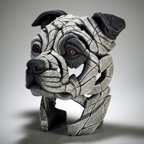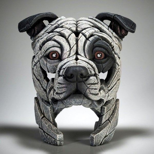 Staffordshire Bull Terrier bust by Matt Buckley - from the EDGE contemporary sculpture collection. Originally bred in the 19th century as a fighting dog, the Staffordshire Bull Terrier is these days very much a family pet and show dog. The Staffy's active, friendly, intelligent and cheeky nature has made them a big hit with owners. Matt Buckley's superb sculpture has caught the spirit of this popular dog perfectly. This sculpture is finished with white tones and a black eye patch.