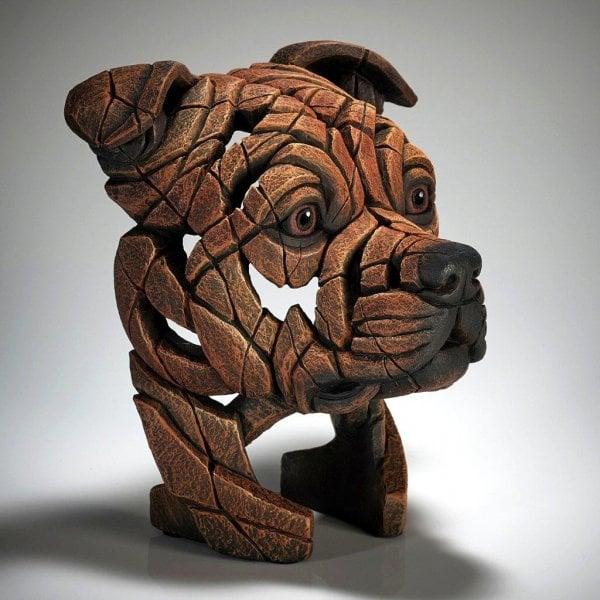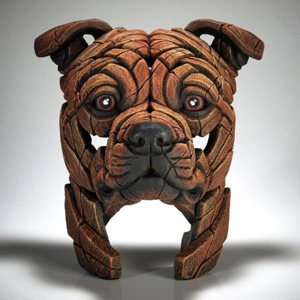 Staffordshire Bull Terrier bust by Matt Buckley - from the EDGE contemporary sculpture collection. Originally bred in the 19th century as a fighting dog, the Staffordshire Bull Terrier is these days very much a family pet and show dog. The Staffy's active, friendly, intelligent and cheeky nature has made them a big hit with owners. Matt Buckley's superb sculpture has caught the spirit of this popular dog perfectly. This sculpture has the red/brown tones of the red coloured Staffy.