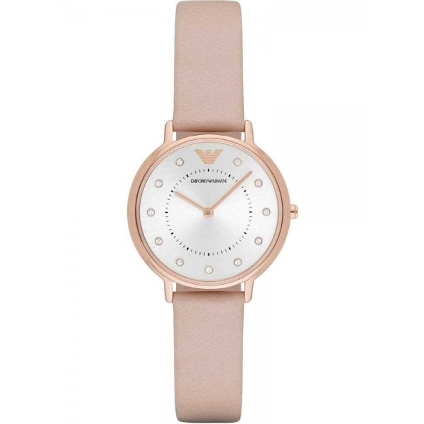 Bring an on trend rose gold glow to your outfits with this beautifully feminine strap watch from Emporio Armani. The gorgeous rose gold plated case houses a round silver dial, with glamorous stone set hour markers and the prestigious Armani logo at 12 o'clock. Complete with a comfortable pink leather strap and traditional buckle.