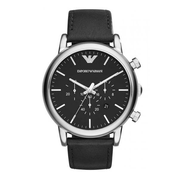 Emporio Armani bring us this stylish contemporary strap watch, ideal for accessorising your attire. Crafted in polished stainless steel the round case houses an attractive black chronograph dial featuring baton hour markers, the iconic Armani logo and a date window for extra functionality. Finished with a comfortable black leather strap it makes the ideal timepiece for everyday wear, buy with confidence.