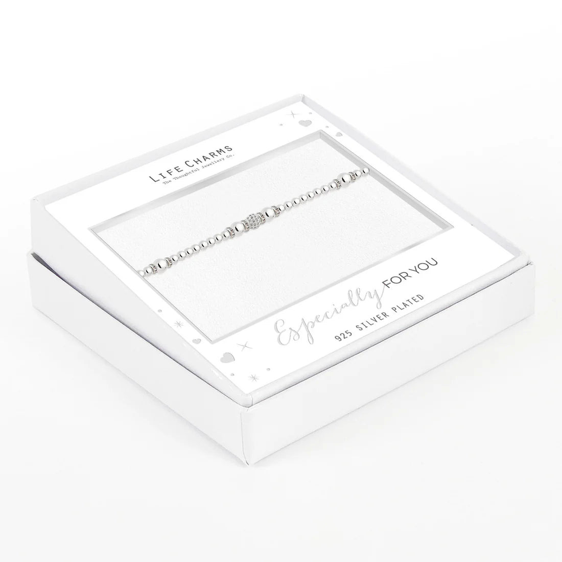 Beautiful beaded bracelet with small rondelles and crystal bead crafted in silver with attention to detail and aesthetic appeal. To add to the luxury experience, each piece of jewellery includes a complimentary gift box.