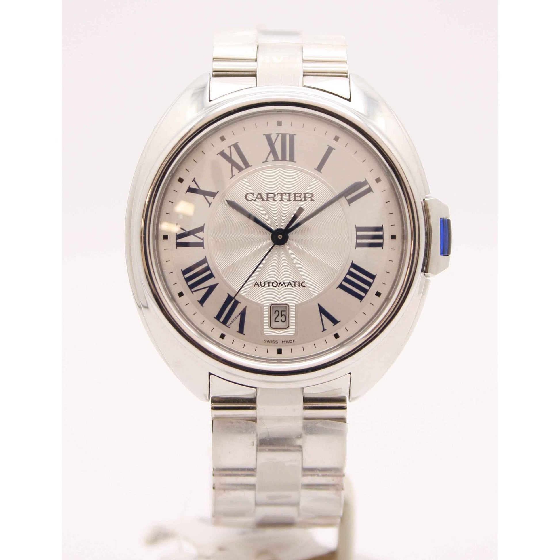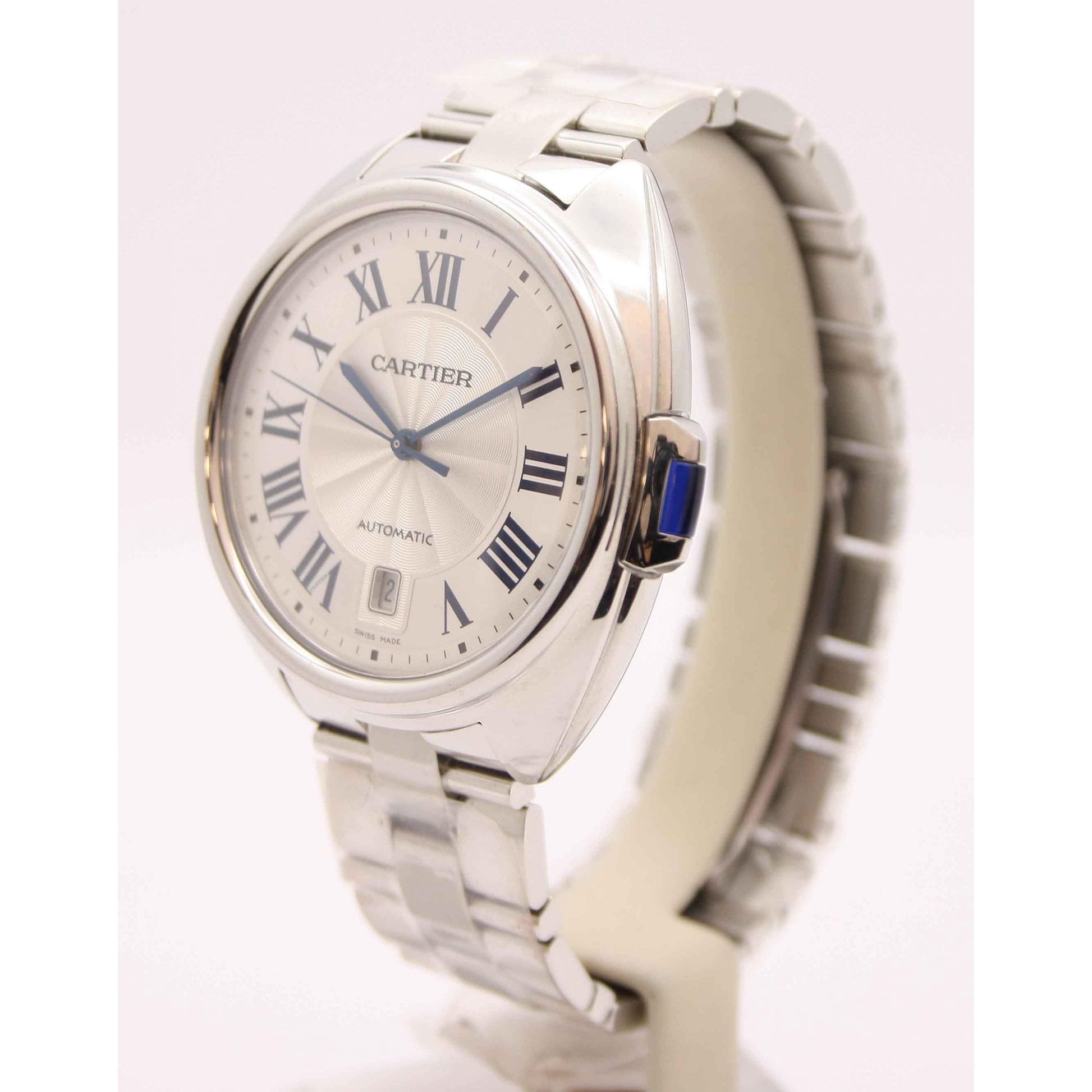 Clé de Cartier watch, 40 mm, Manufacture self-winding mechanical movement, calibre 1847 MC. Steel case, key set with a synthetic spinel, silvered flinqué sunray effect dial, blued-steel sword-shaped hands, sapphire crystal and case back, steel bracelet. Case thickness: 11.76 mm. Water-resistant to 3 bar (approx. 30 metres).