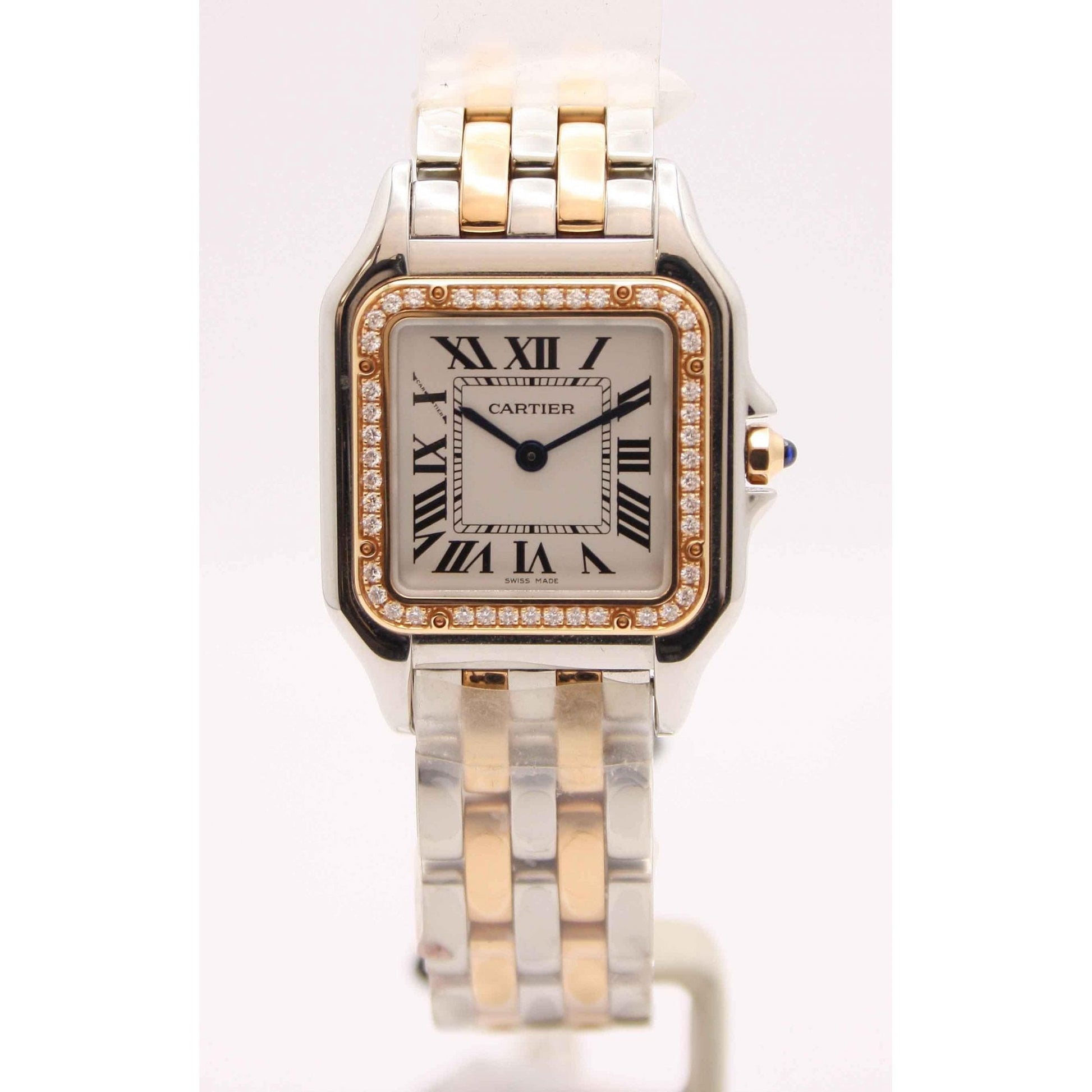 Panthère de Cartier watch, medium model, quartz movement. Case in 18K rose gold and steel, bezel set with brilliant-cut diamonds, dimensions: 29 mm x 37 mm, thickness: 6 mm, crown set with a synthetic blue spinel, silvered dial, blued-steel sword-shaped hands, bracelet in 18K rose gold and steel, water-resistant to 3 bar (approx. 30 metres).