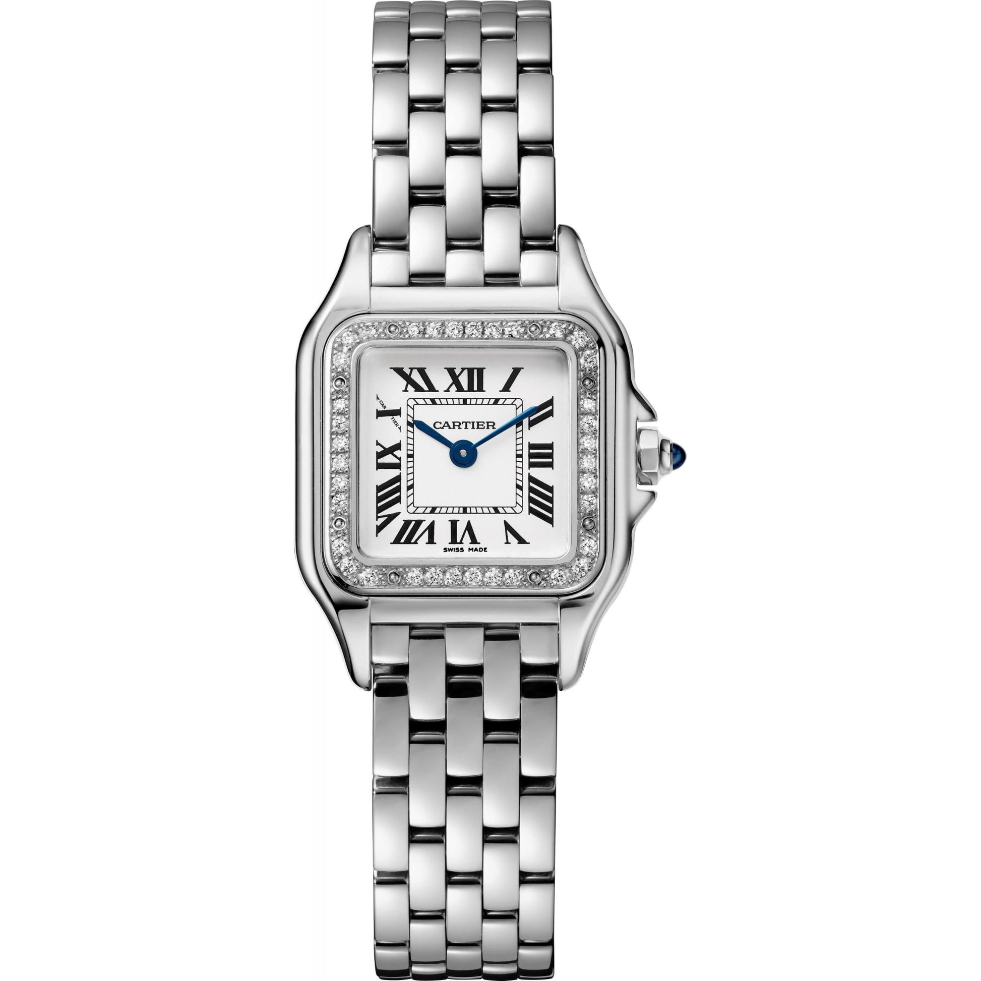 Panthère de Cartier watch, small model, quartz movement. Case in steel, dimensions: 23 mm x 30 mm, thickness: 6 mm, crown set with a synthetic blue spinel, silvered dial, blued-steel sword-shaped hands, steel bracelet. Water-resistant to 3 bar (approx. 30 meters).