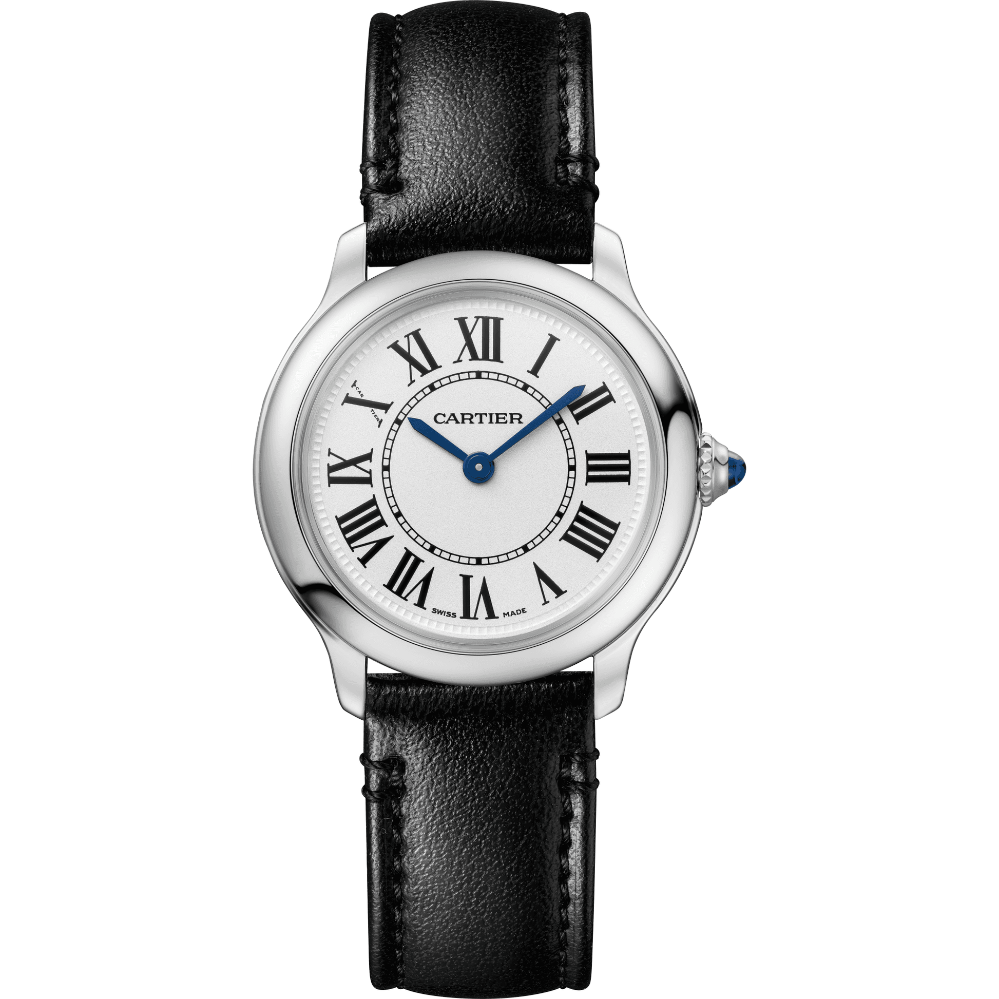 Ronde Must de Cartier watch, 29 mm, high autonomy quartz movement (approx. 8 years). Steel case, beaded crown set with a synthetic cabochon-shaped spinel, sandblasted silvered dial, blued-steel sword-shaped hands, sapphire crystal, black strap (made without animal materials), steel ardillon buckle. Thickness: 7.54 mm. Water-resistant to 3 bar (approx. 30 metres).