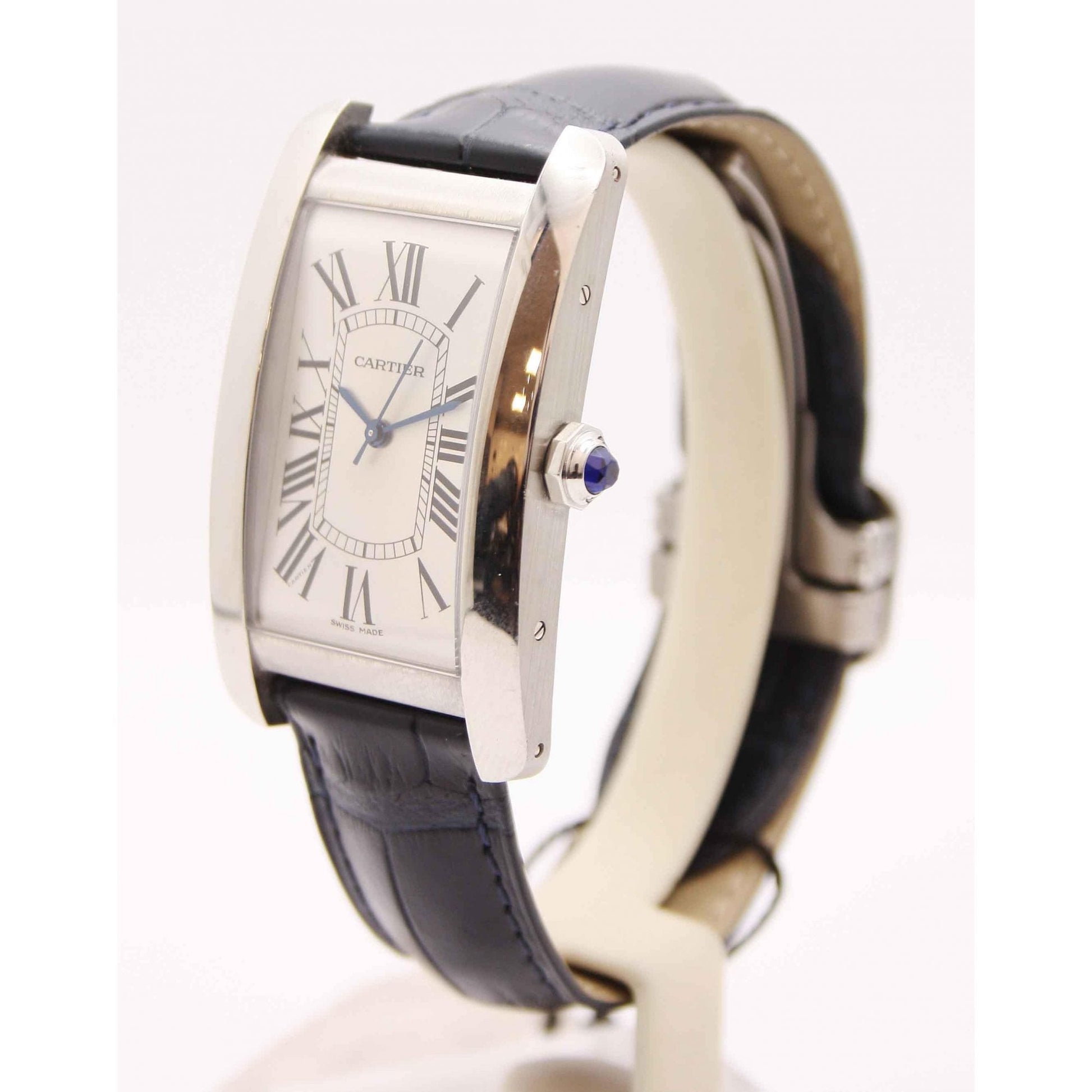 Tank Américaine watch, large model, mechanical movement with automatic winding. Case in steel, octagonal crown set with a synthetic blue spinel, silvered dial, blued-steel sword-shaped hands, strap in semi-matte navy blue alligator skin, 18 mm adjustable folding buckle. Case size: 45.10 mm x 26.60 mm, thickness: 9.65 mm. Water-resistant up to 3 bar (approx. 30 meters/100 feet).