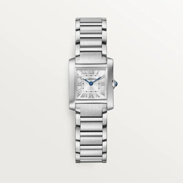 Tank Française watch, small model, quartz movement. Steel case. Faceted crown in steel decorated with a synthetic cabochon-shaped spinel. Silvered sunray dial, blued-steel sword-shaped hands, sapphire crystal. Steel bracelet. Case dimensions: 25.7 mm x 21.2 mm, thickness: 6.8 mm. Water-resistant up to 3 bar (approx. 30 meters/100 feet).