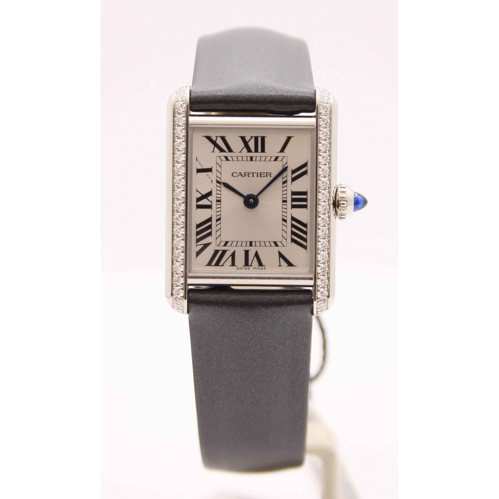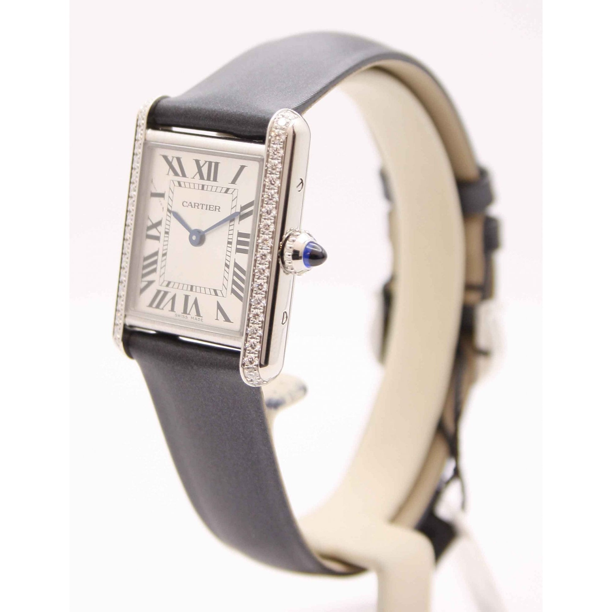 Tank Must watch, small model, high autonomy quartz movement. Steel case, bezel set with 40 brilliant-cut diamonds totaling 0.39 carats, beaded crown set with a synthetic cabochon-shaped spinel, silvered dial, blued-steel sword-shaped hands, interchangeable black brushed calfskin strap, steel ardillon buckle. Case dimensions: 27 mm x 22 mm, thickness: 6.6 mm. Water-resistant up to 3 bar (approx. 30 meters/100 feet).