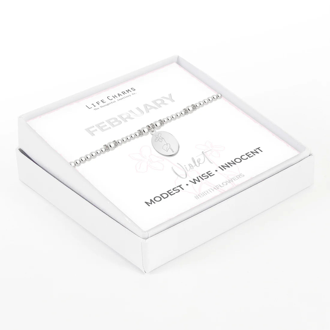 Silver beaded design and shimmering oval charm engraved with the outline a Violet - February birth flower.