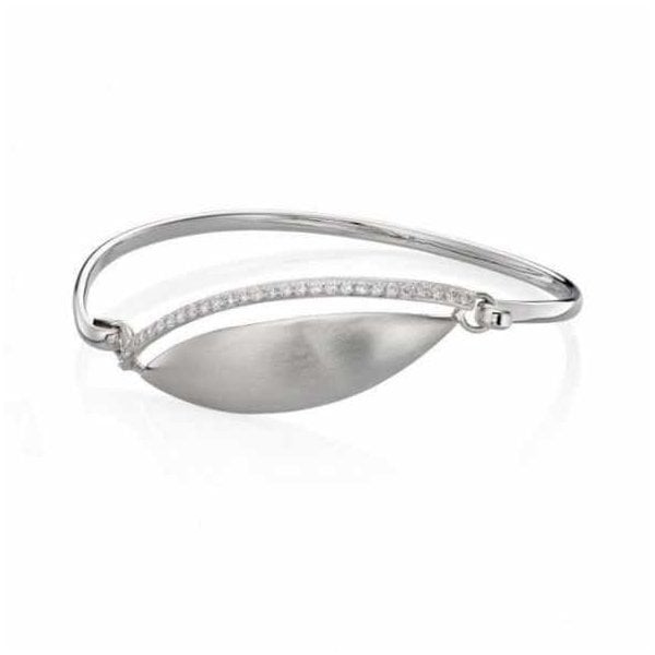 Silver flip top Fiorelli bangle with a satin finish eye shape top and a line of claw set cubic zirconias set on one side.