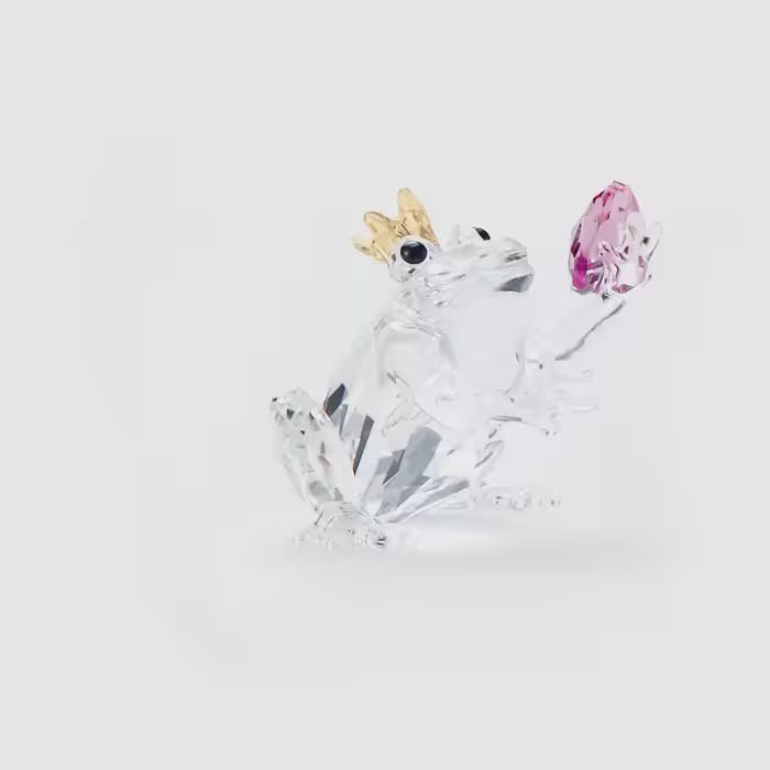 Made with love for lovers, the sparkling Frog Prince by Swarovski is a charming collectable with a smiling face and friendly jet black eyes. It is made from sparkling crystals with 245 facets that reflect incoming light beautifully. The figurine holds a rose-coloured crystal heart in its hand, while the crown shines with a golden shadow effect. A lovely gift for romantic occasions. Decoration object. Not a toy. Not suitable for children under 15.